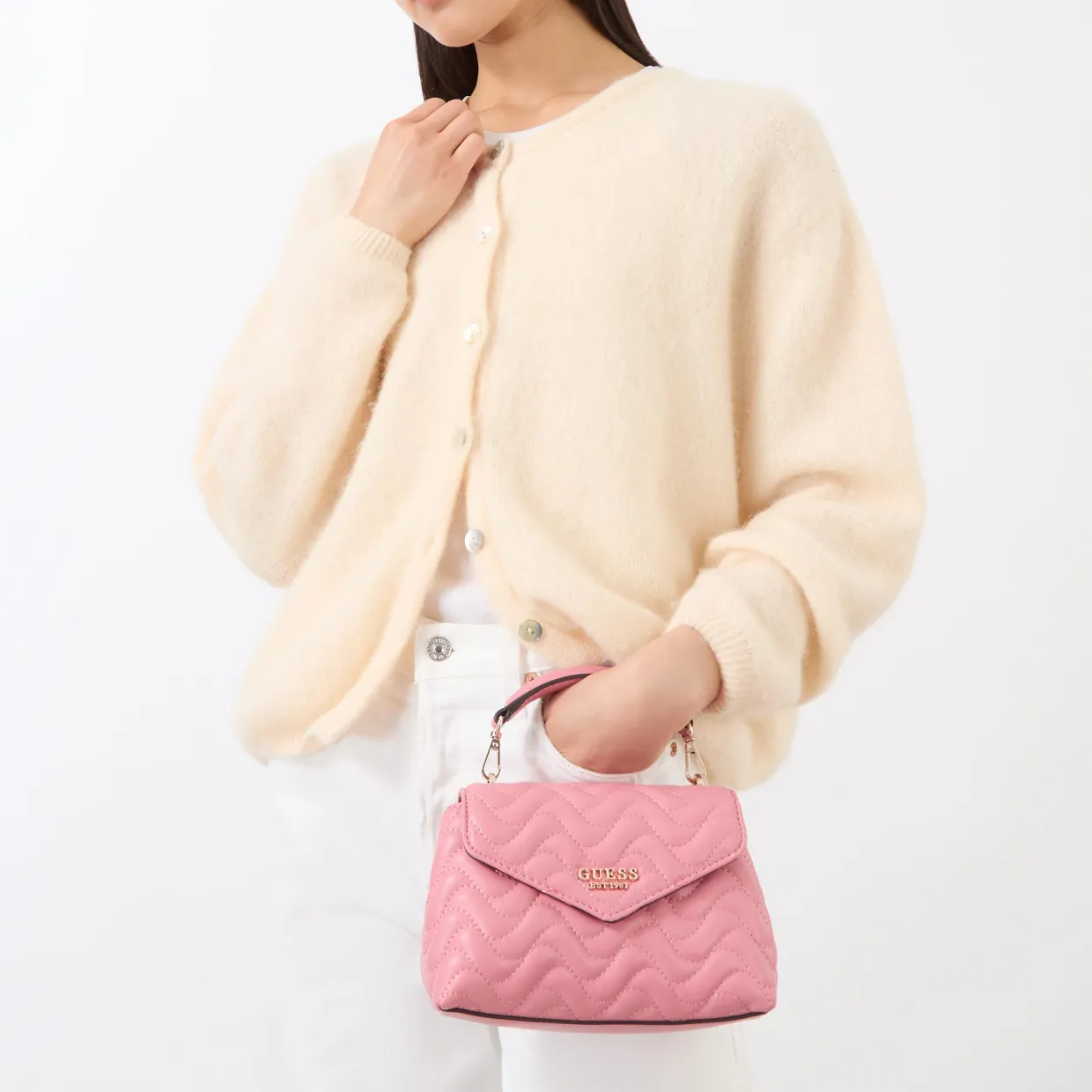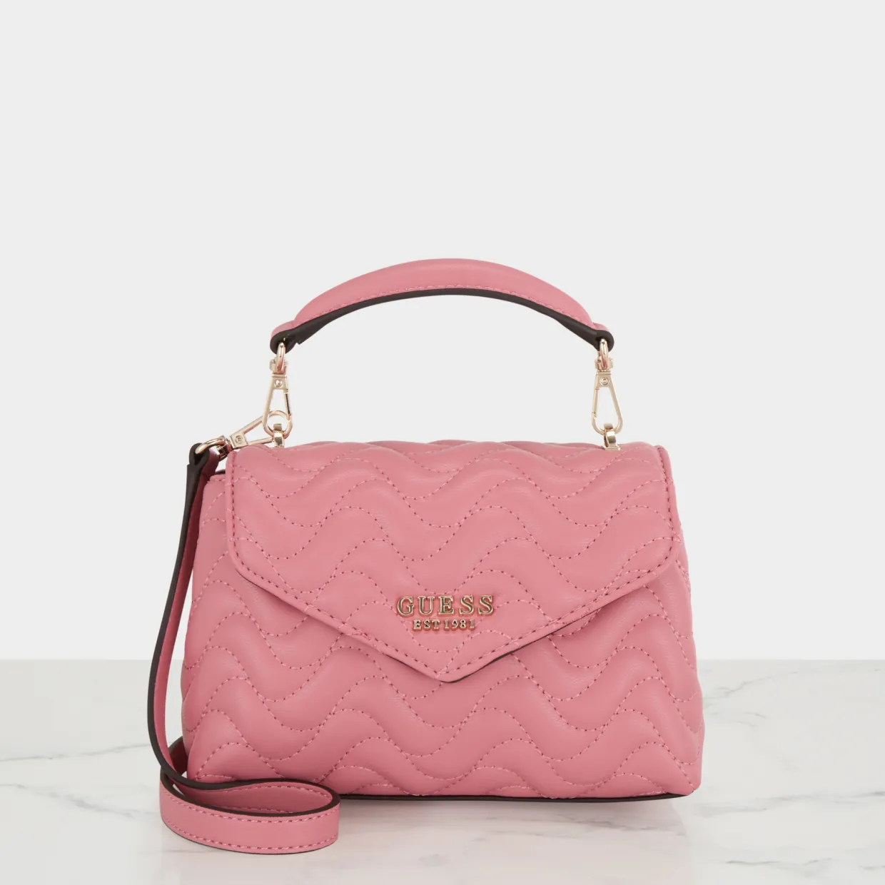 - Carry handle, flap closure with magnetic snap fastening, detachable and adjustable shoulder strap, logo hardware, gold-tone finish, quilted design, tonal stitching