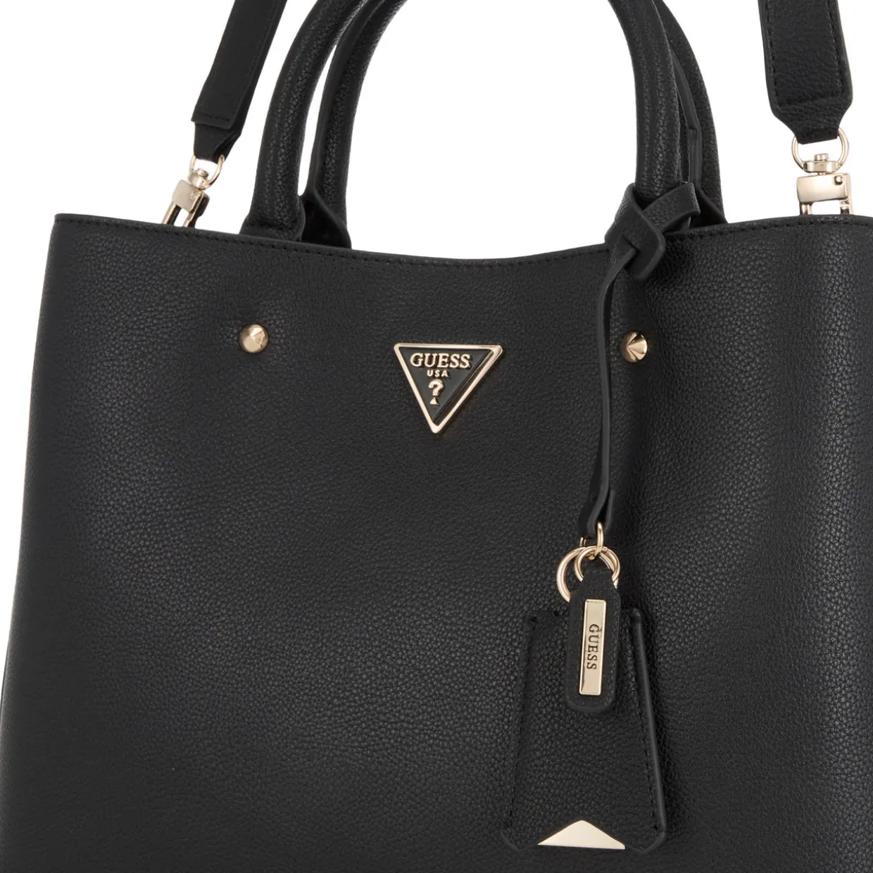 - Zip and double-button closure, silver-tone hardware, stud detailing, triple internal compartment, two top handles, detachable crossbody strap, detachable logo-detail charm, metal triangle logo