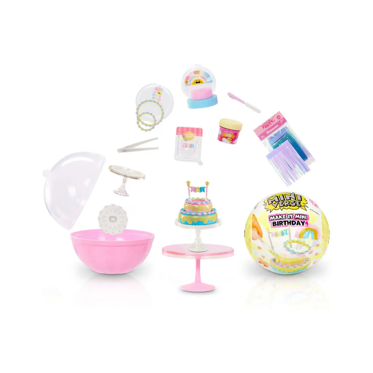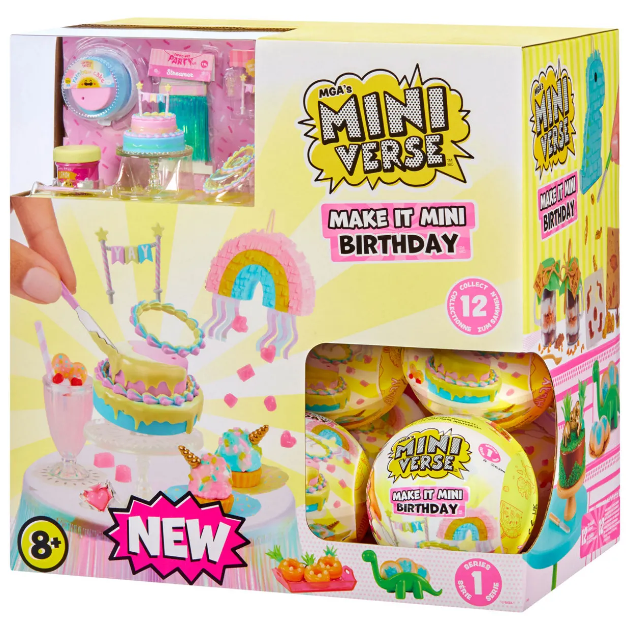 - Each ball comes with realistic mini items to make your own party essentials, matching one of three party themes: Rainbow, Dino, and Tropical, each package is a SURPRISE so you won’t know which mini you have until you unbox it, follow the included instructions to make and set your mini, once it’s set you’ve got a collectible ready for display, each set includes mini tables perfect for showcasing your collection