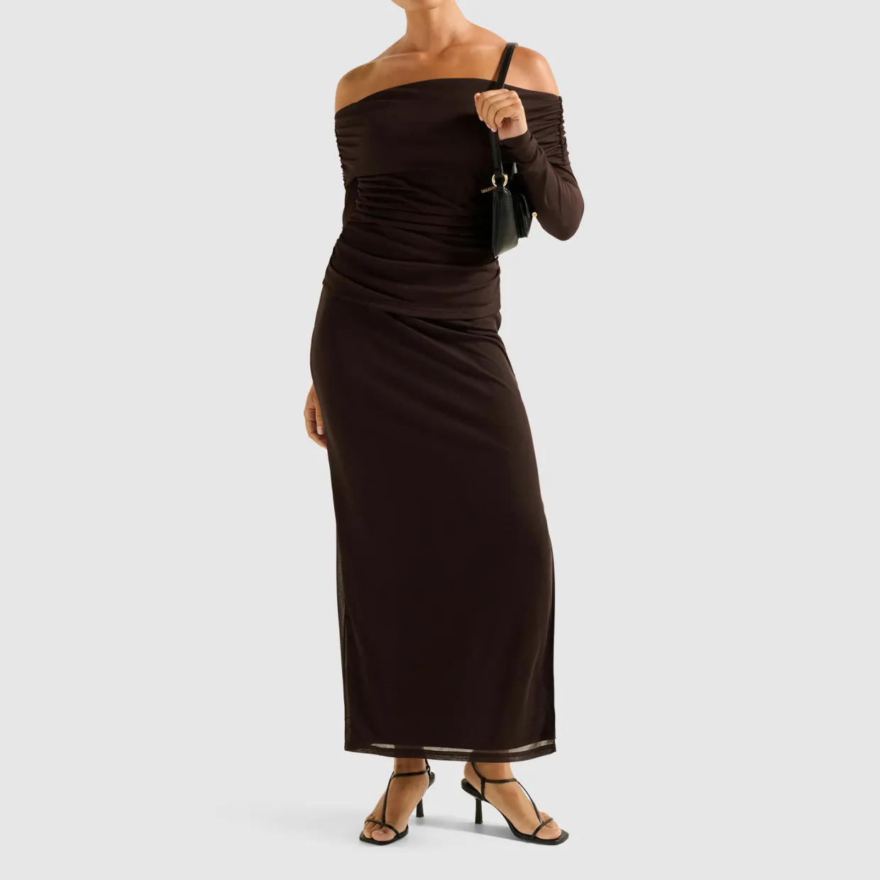 - High-rise waist, mesh fabrication, side split, fully lined, maxi length