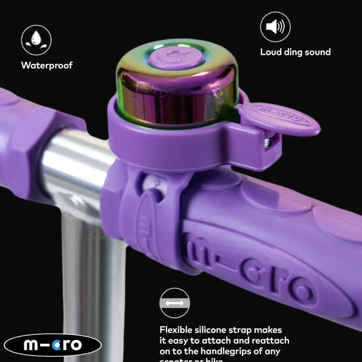 - Suitable for all scooters and bikes, waterproof, flexible silicone strap, multiple fastening settings, loud ding sound