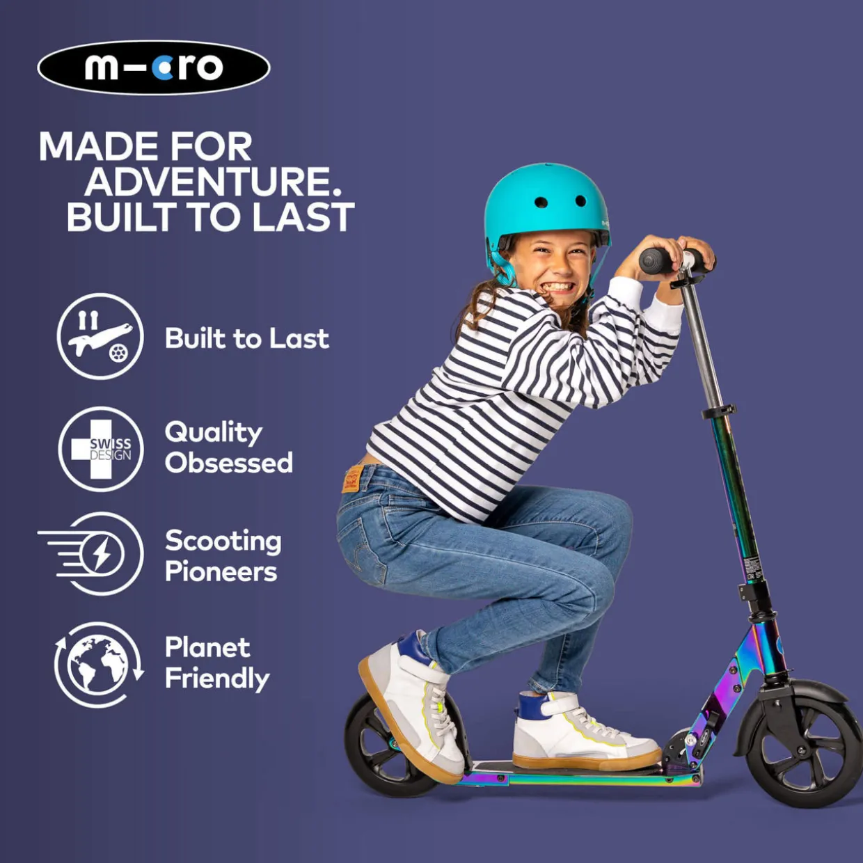 Micro are committed to simplifying everyday journeys and adding fun for you and the family, all while doing your part for the planet. Safety is at the core of the brand’s philosophy, paired with innovative Swiss design to create a range of styles, including 3-wheel and foldable, in different colourways and sizes. Choose between a Micro or Mini and pair it with any of the vibrant accessories available.