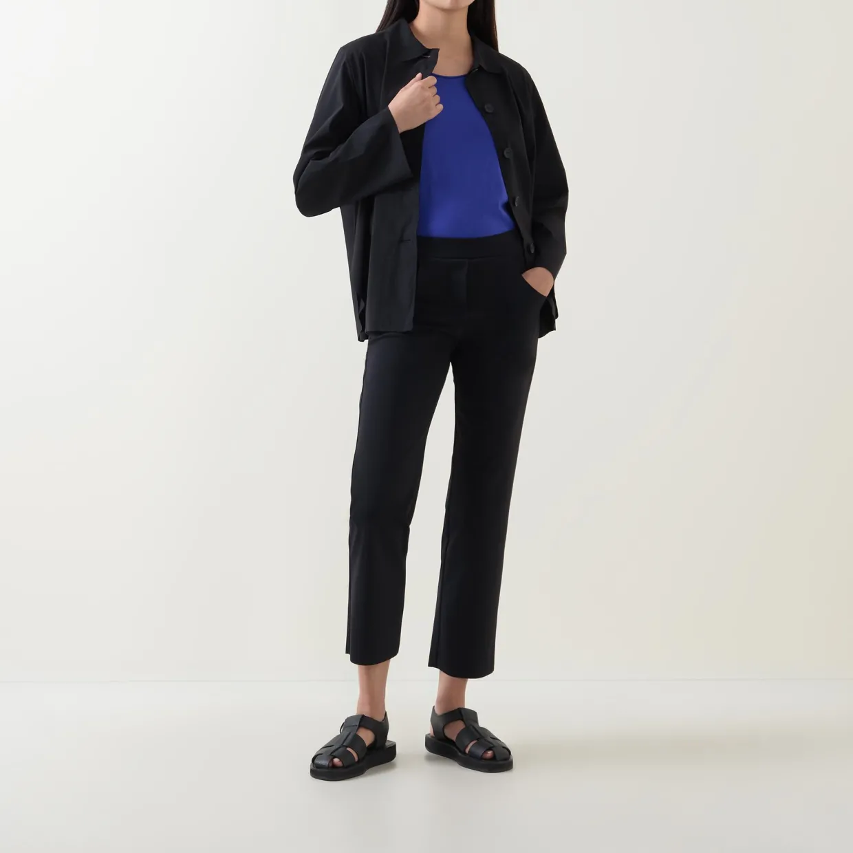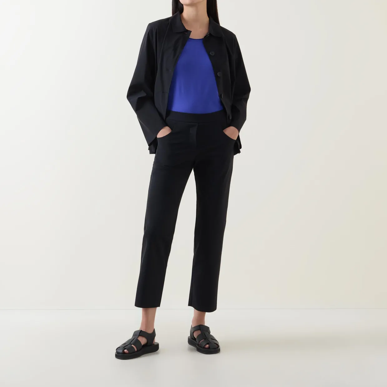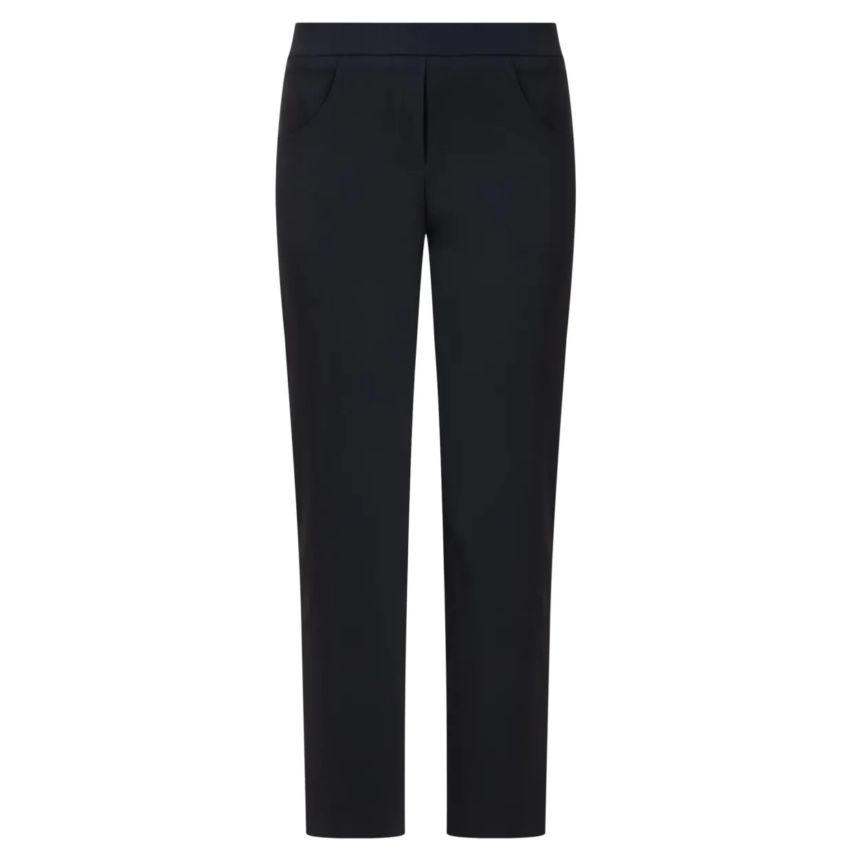 - Concealed zip-fastening closure, two side in-seam pockets, tonal stitching, mid-rise, straight-cut leg, smooth fabric