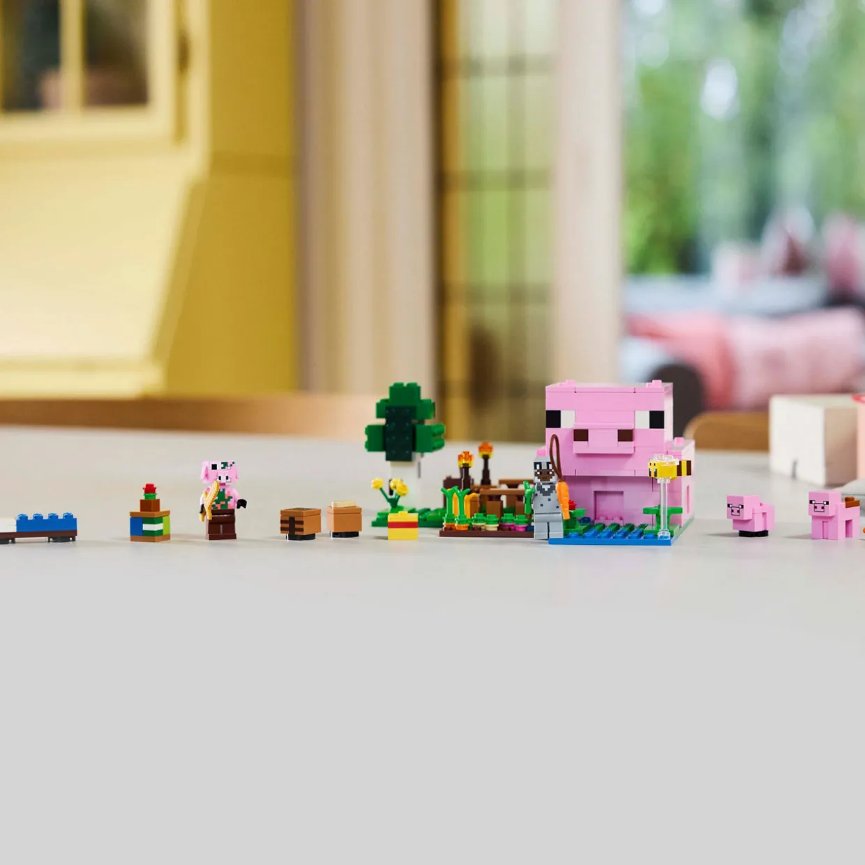 - 238 pieces, buildable pig-shaped house that comes with a farm plot where potatoes and beets grow, a field with a gate to guide the baby pig through and more, includes a hero character in a wolf skin, a baby pig, bee, an adult pig and a zombified piglin