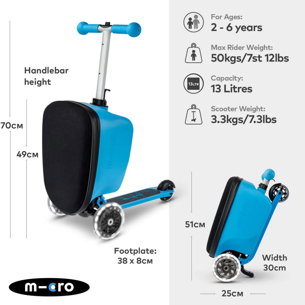 - Hand luggage compatible, 13L storage, luggage and scooter all-in-1, LED wheels, lean to steer, height adjustable handlebar, innovative folding mechanism
