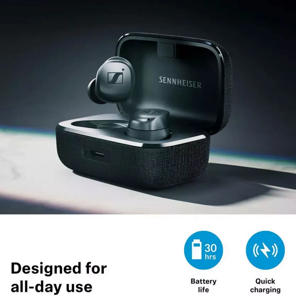 Sennheiser signature sound: Delivers exceptional sound fidelity, ensuring every detail and emotion is heard just as the artist intended thanks to our TrueResponse transducer system which delivers a high-end sound experience with impactful bass and a refined treble response.Adaptive Noise Cancellation (ANC): Automatically adjusts noise cancellation to surroundings, providing an immersive listening experience.Future-proof technologies: Step into the future with Auracast™ support and LE Audio* and enjoy the latest codecs with Bluetooth® 5.4 compatibility.All day comfort: Assorted sizes of soft silicon ear tips and fins ensure a comfortable fit for extended listening sessions.Sound personalization: Choose between multiple ways of customizing your sound: guided tests for personalized sound profiles, adaptative 5-band EQ, Sound Zones, Sound Check or pre-set modes. Up to 30 hours playtime with new battery system and fast Qi wireless charging: 8 minutes of charging thanks to our battery protect mode for 1 hour of playback. Lossless Audio: Guarantees flawless bit-by-bit transmission of audio, maintaining uncompromised sound quality during wireless listening.