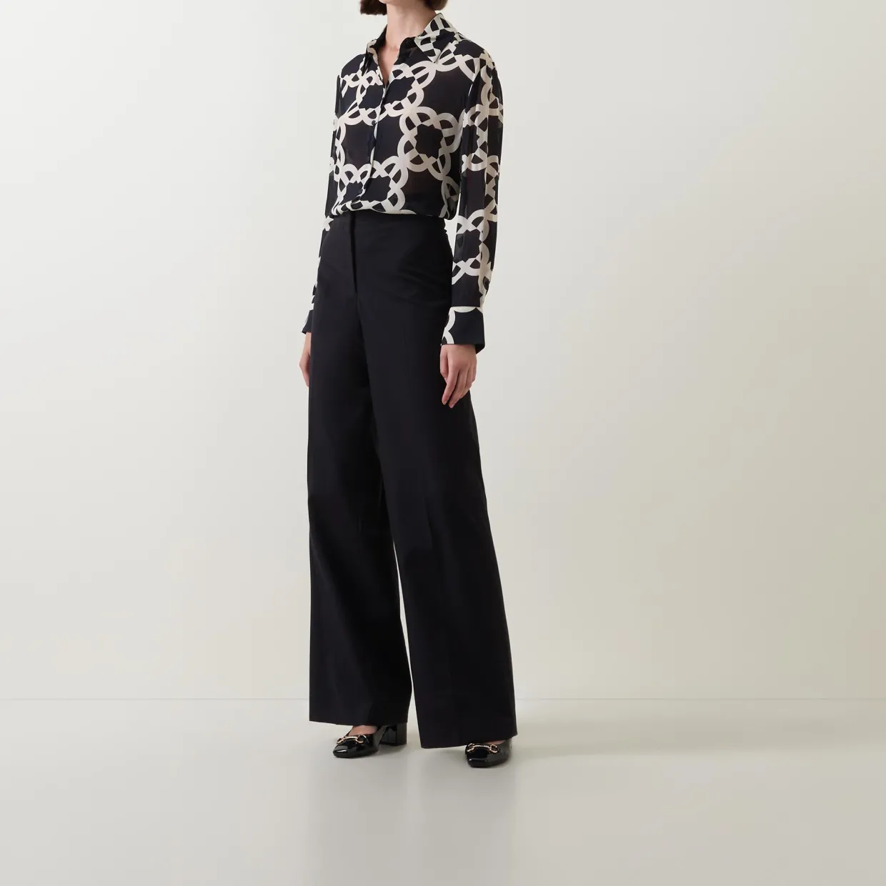 - Point collar, long sleeves, front button fastening, curved hem, monogram logo print, two-tone design, semi-sheer finish