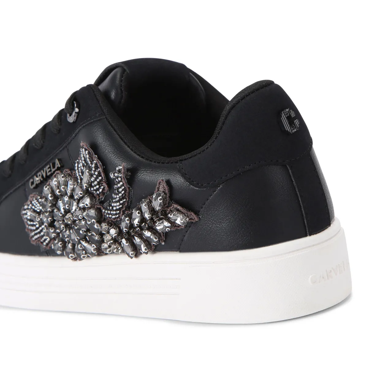 - Low-top style, faux leather, branded details, floral jewel patch