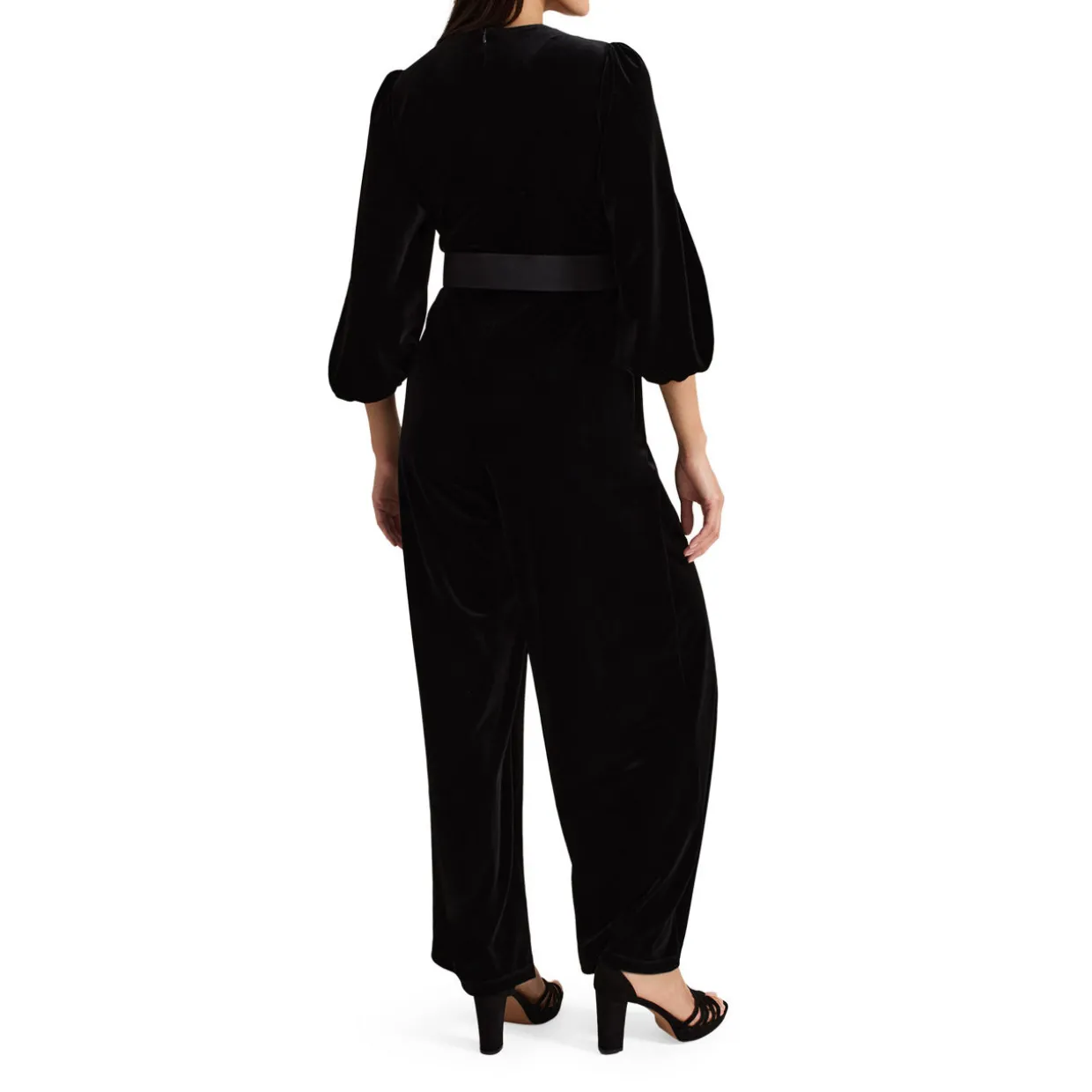 - V-neckline, wrap-style bodice, half-length balloon sleeves, rear zip fastening, belt loops with buckle fastening, gold-tone hardware, straight-leg, clean hems, velvet finish