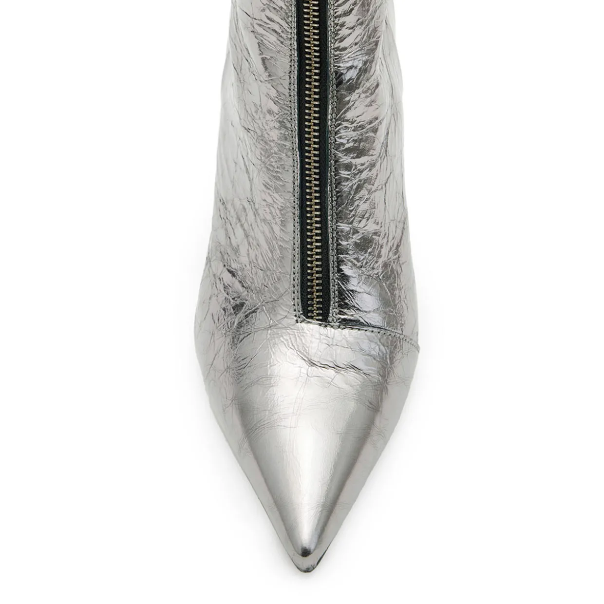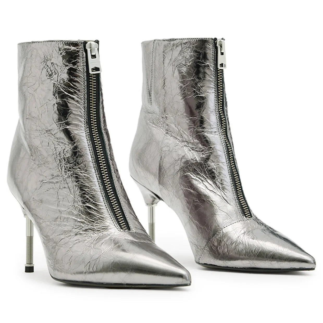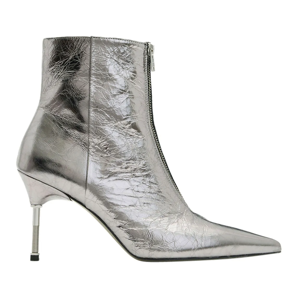 - Pointed toe, stiletto heel, front zip fastening, gold-tone hardware, metallic finish