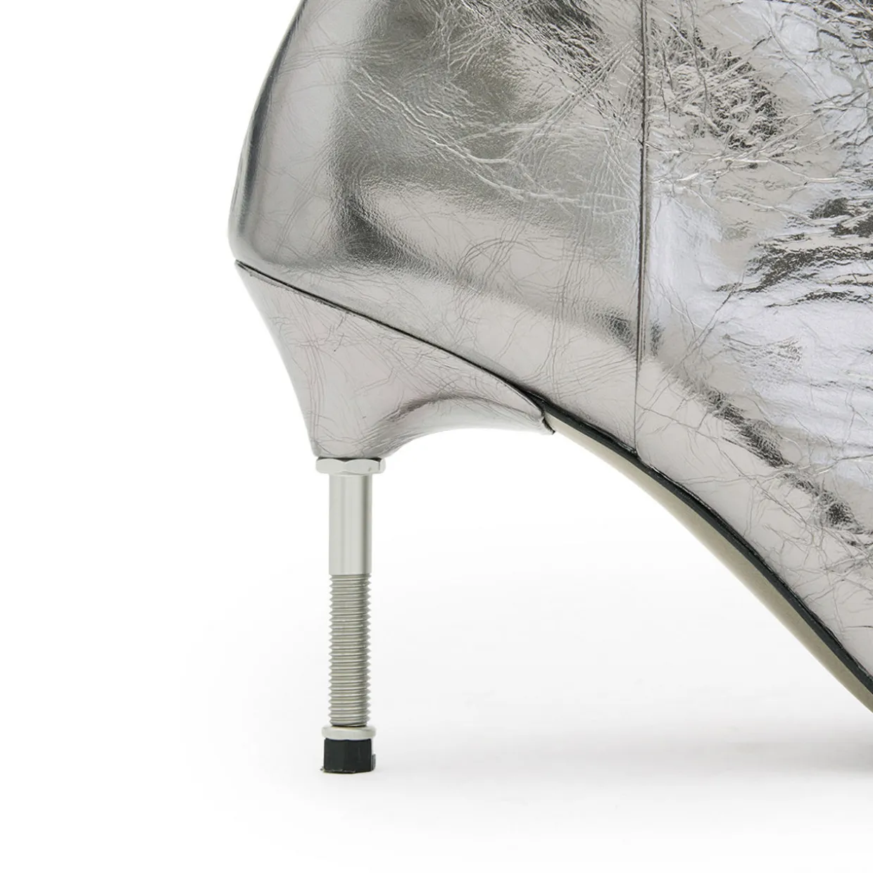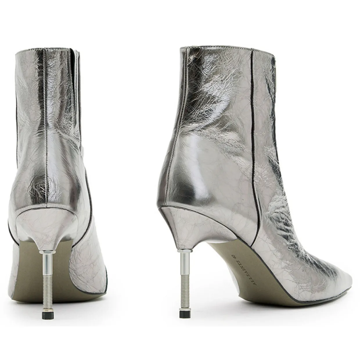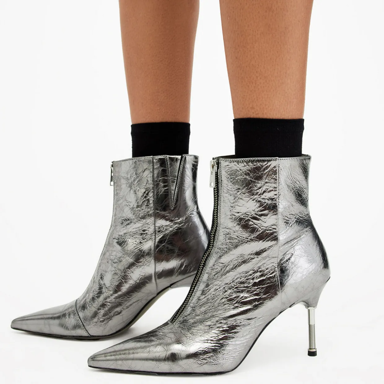 - Pointed toe, stiletto heel, front zip fastening, gold-tone hardware, metallic finish