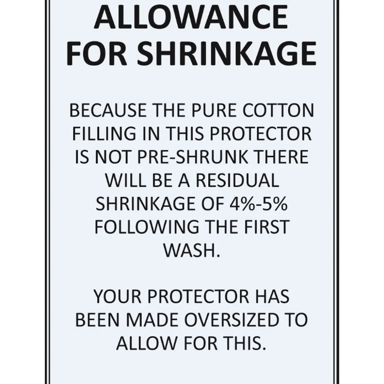 - Because the cotton fillng in this mattress is not pre washed there will be 4 to 5% residual shrinkage after the first wash. The mattress protector been made oversized to allow for this.