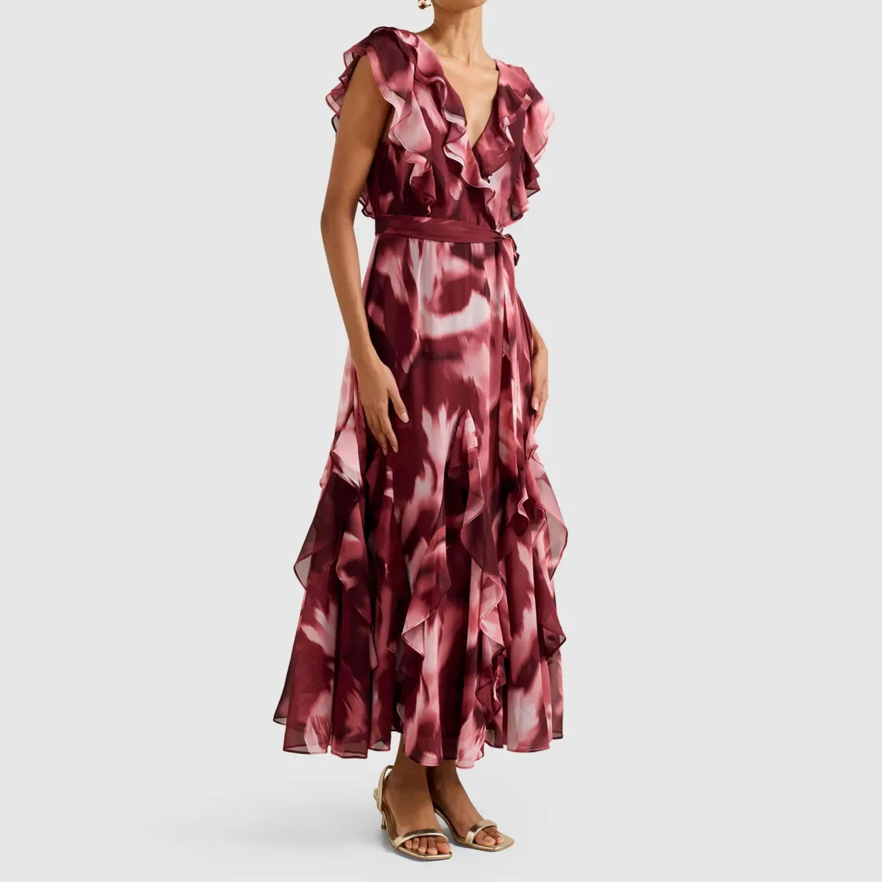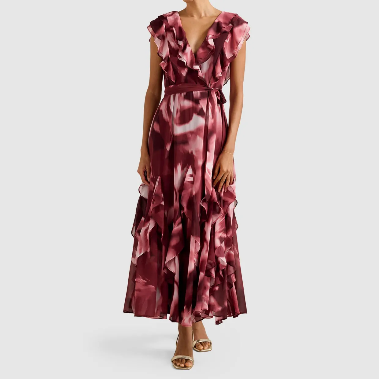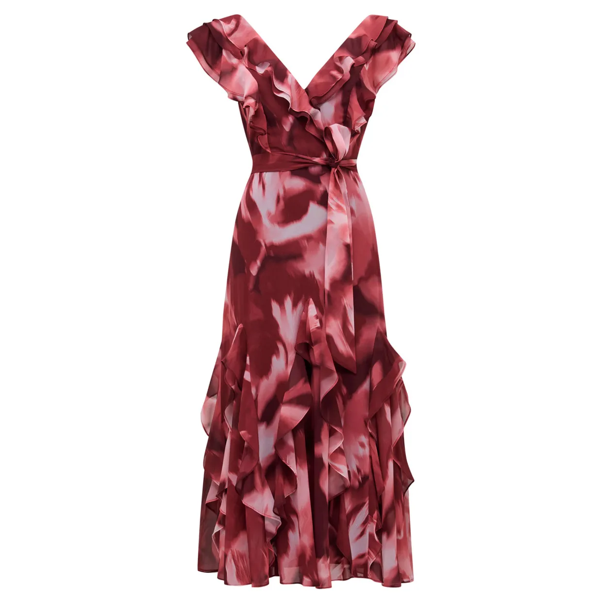 - Petite Collection’ piece, fit-and-flare silhouette, plunging V-neckline, ruffle trim, sleeveless design, painterly floral print