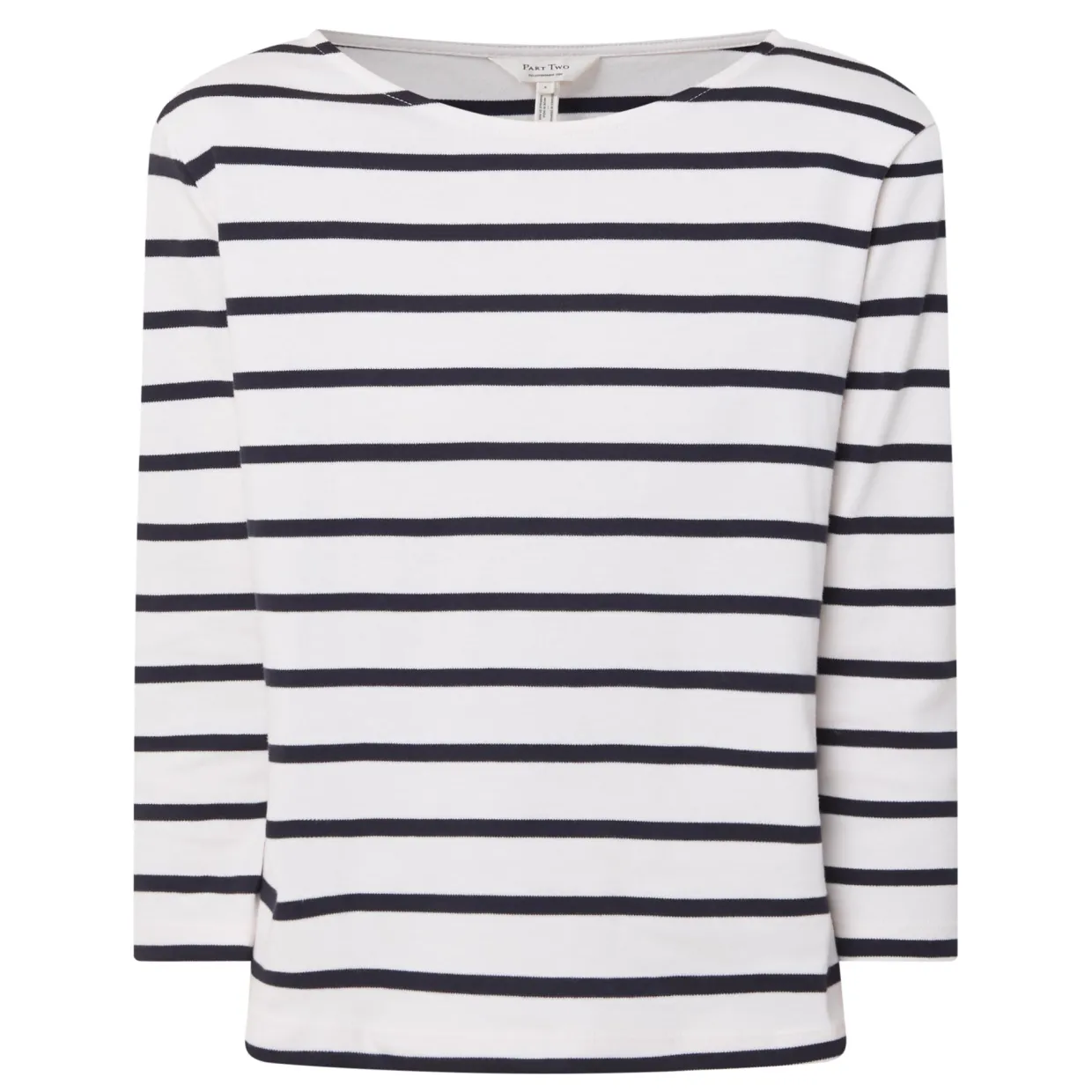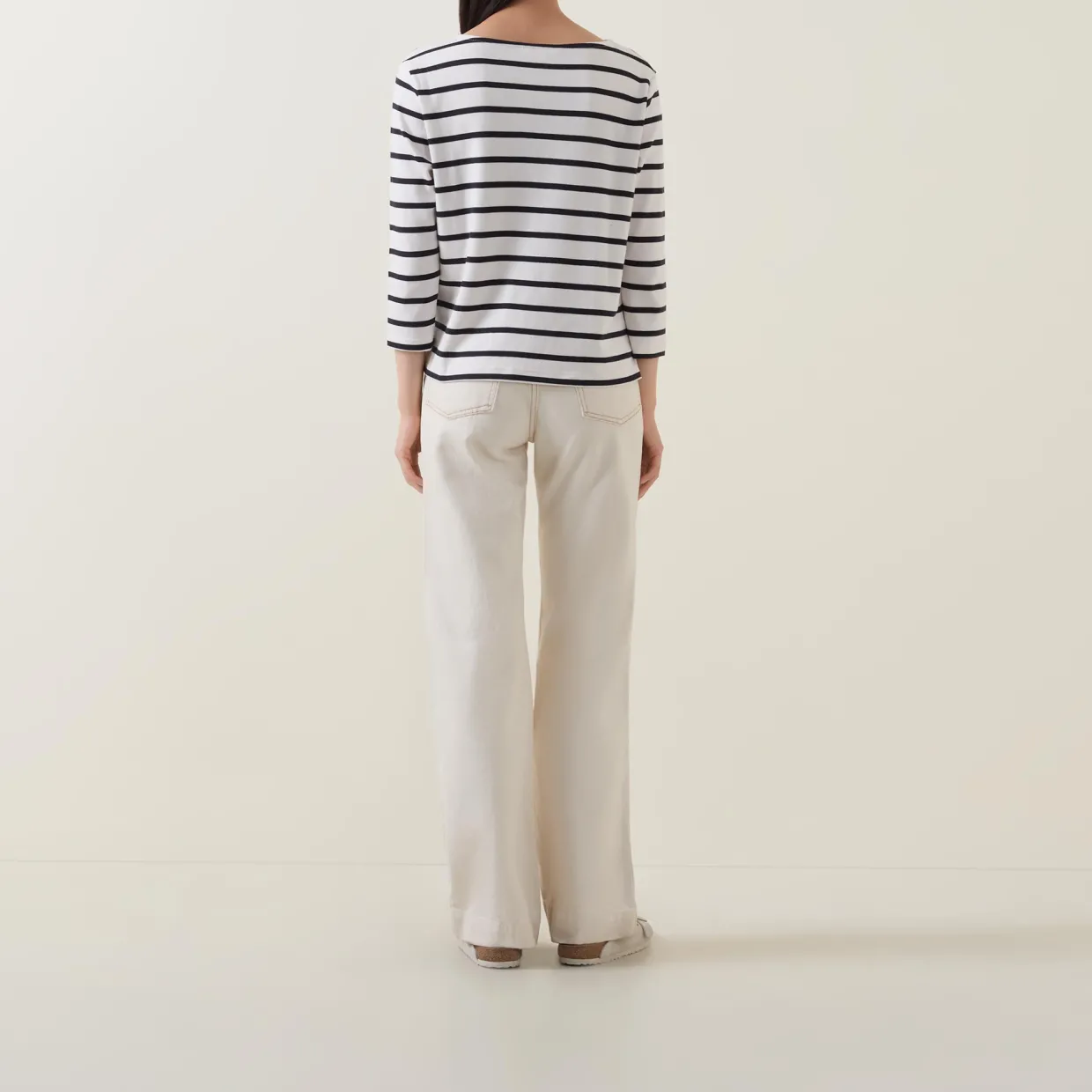 - Round neck, cropped sleeves, straight hemline, striped