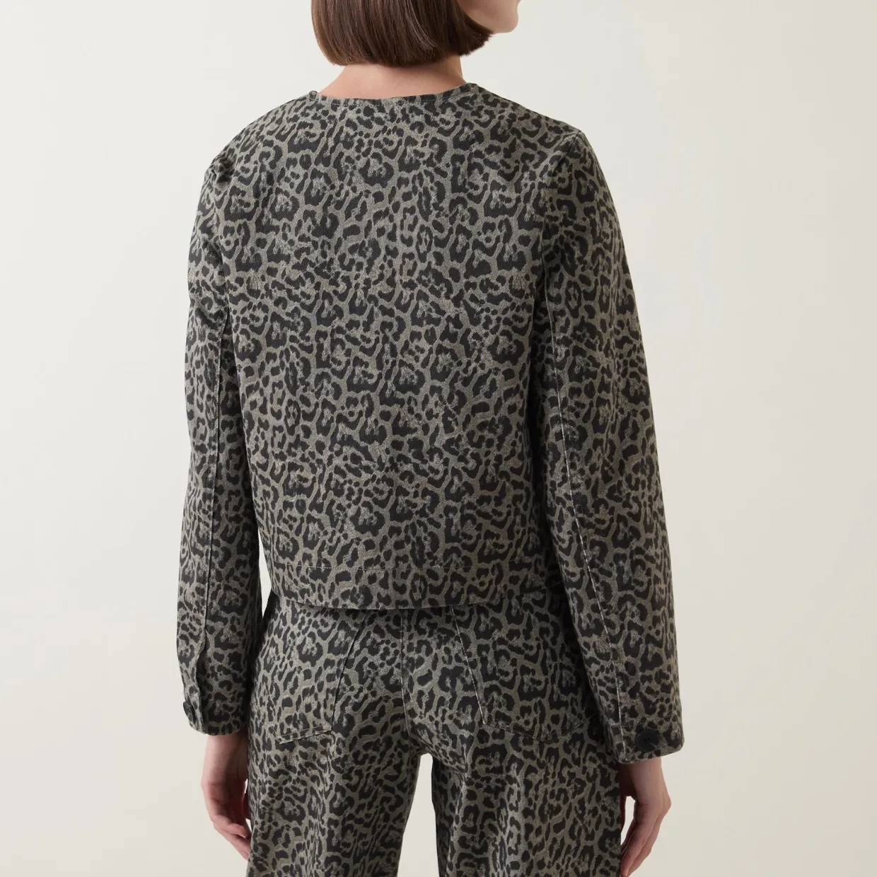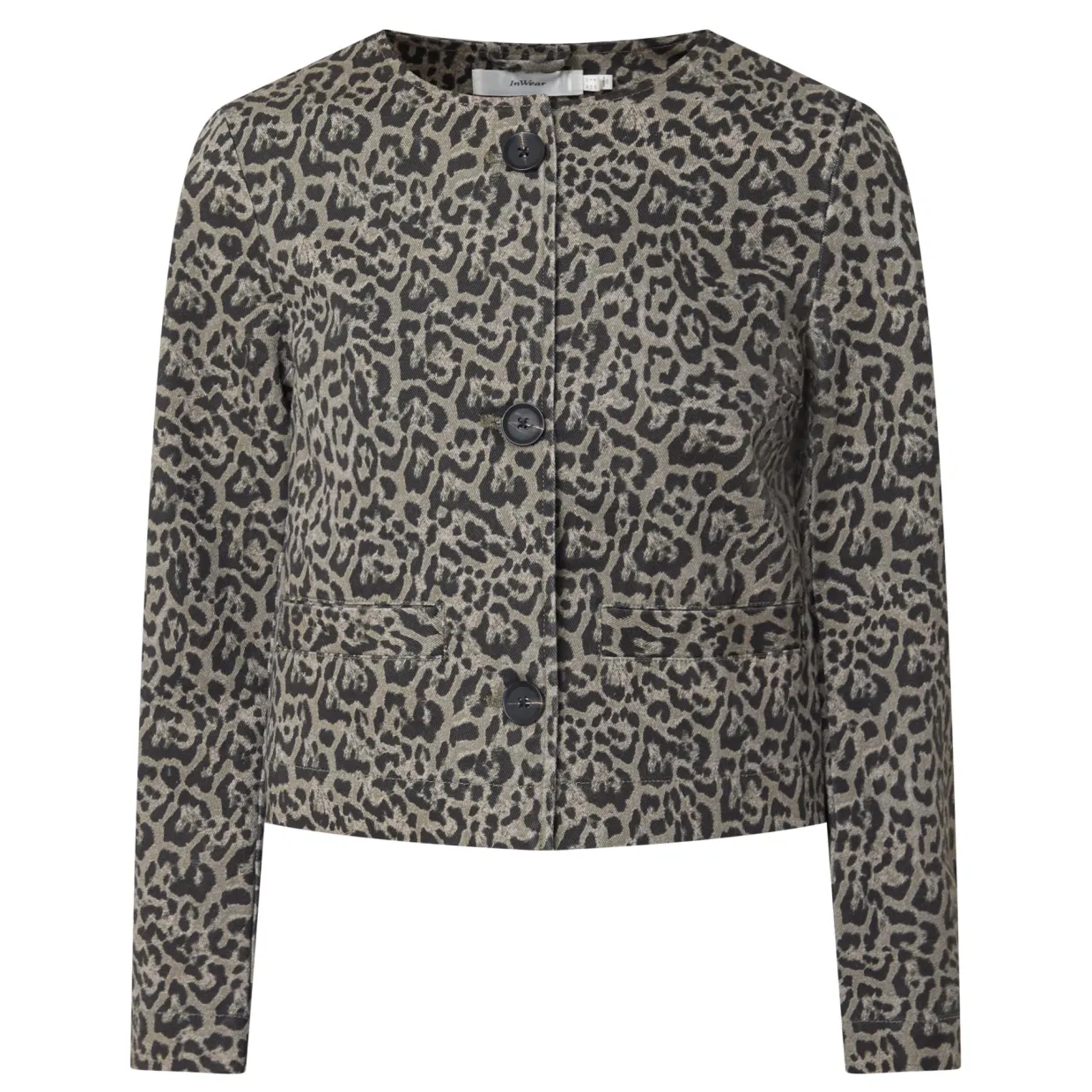 - Round neckline, long sleeves, button fastenings, slip pockets, leopard print, straight hemline