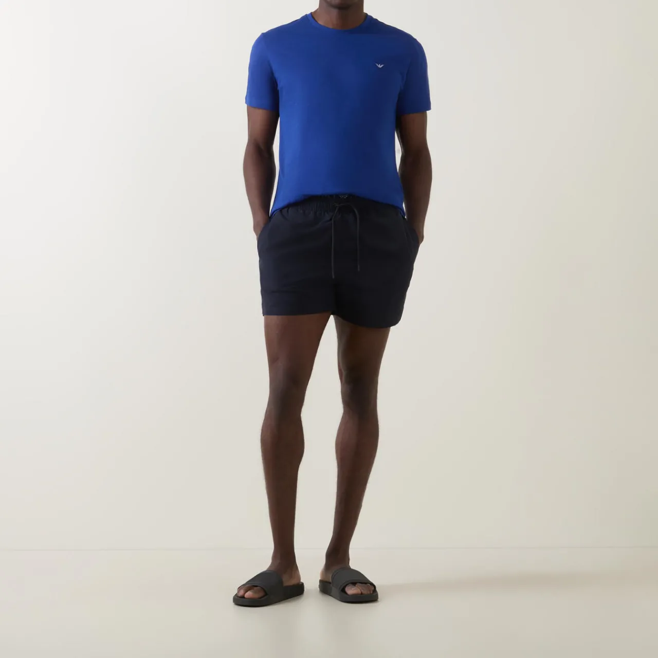 - Double waistband, one interior layer with branding, one exterior elasticated waistband with drawstring adjustable fit, side entry pockets, logo details