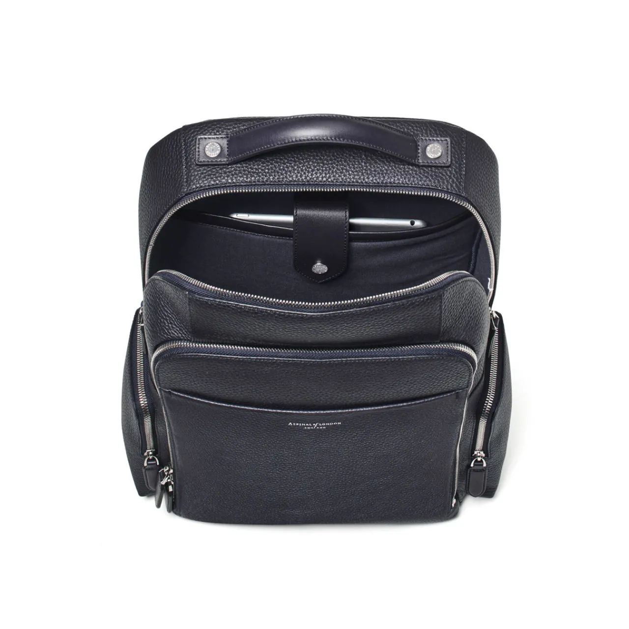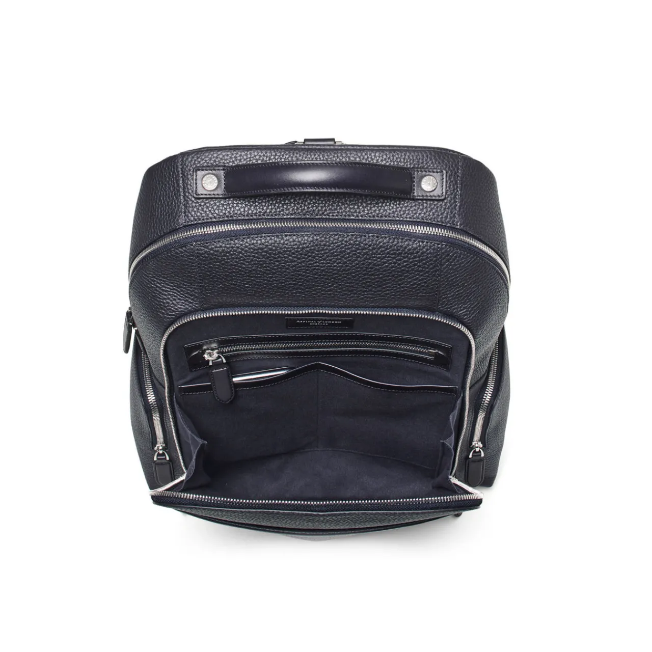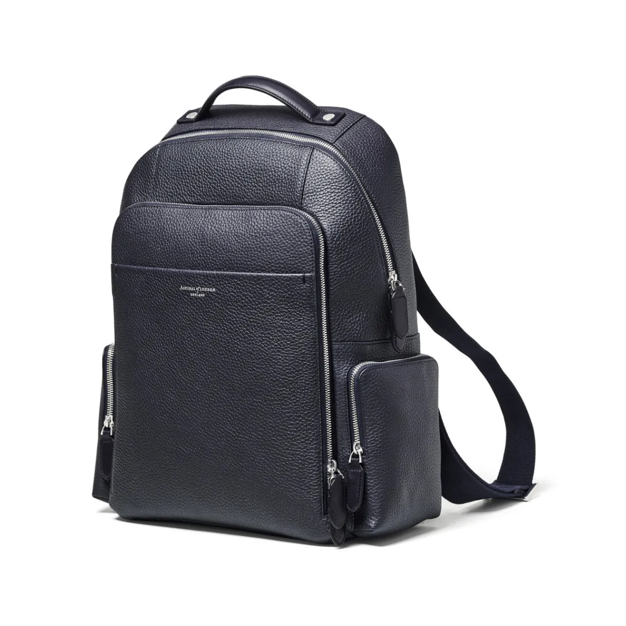 - Top carry handle, adjustable padded straps, zip-around fastening, outer front zip-fastening pockets, two side zip-fastening pockets, logo branding, silver-tone hardware, pebbled leather finish