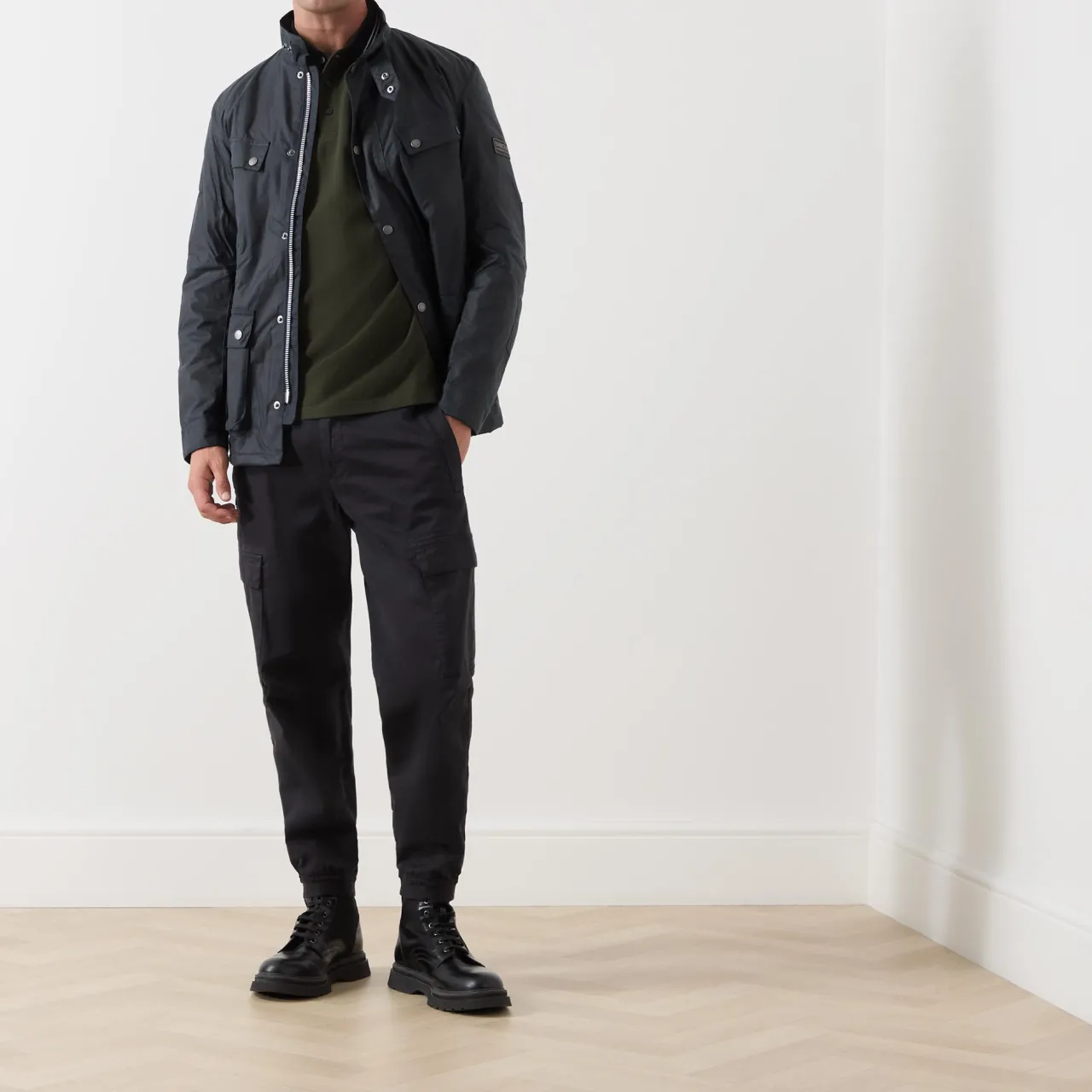 - Snap button and concealed zip fastening, press stud throat strap, quilted lining, two chest pockets, two bellow pockets, one internal pocket, silicone logo badge