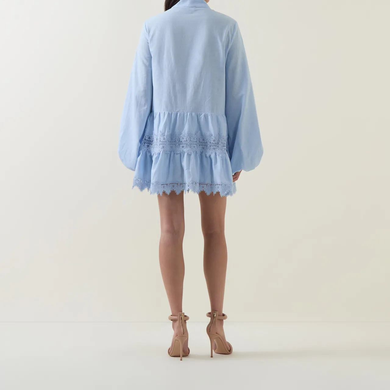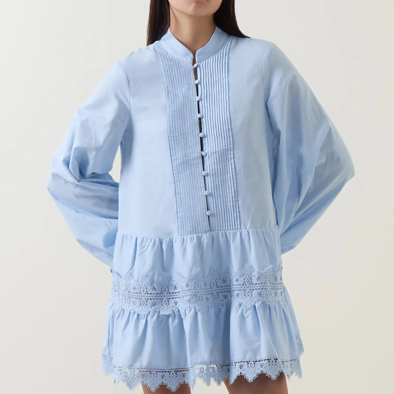 - Long puff sleeves, collarless, button fastenings, pintuck panels, elasticated cuffs, delicate lace detailing, scalloped lace edges, mini length