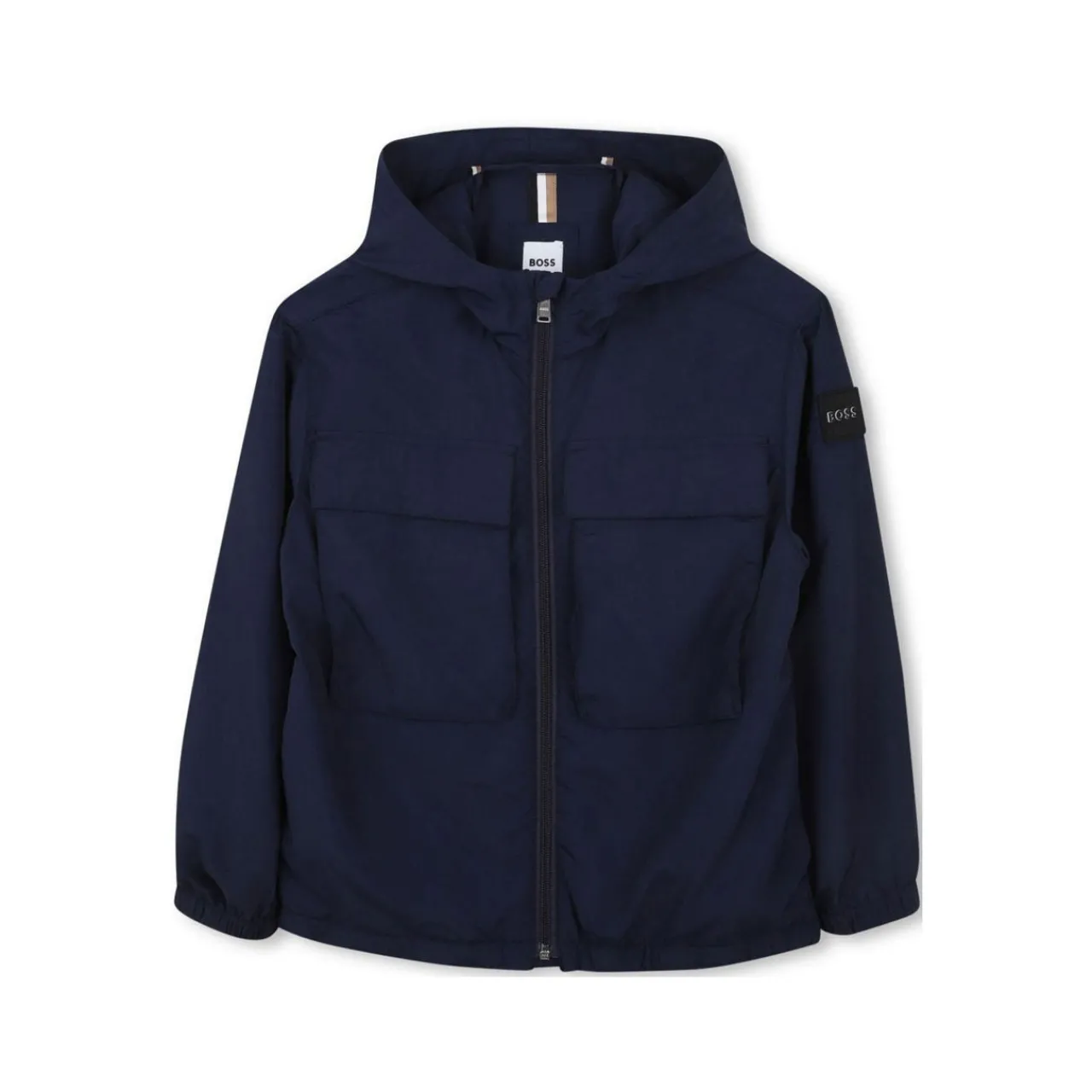 - Hood, windbreaker style, crinkled material, two front flap pockets, logo badge, three-color woven label, long sleeves, front zip fastening