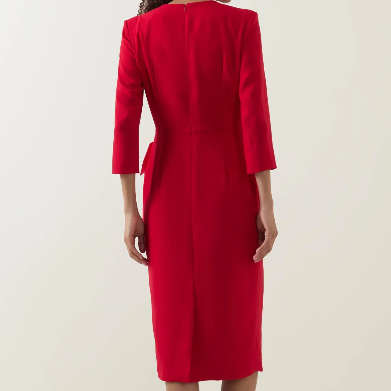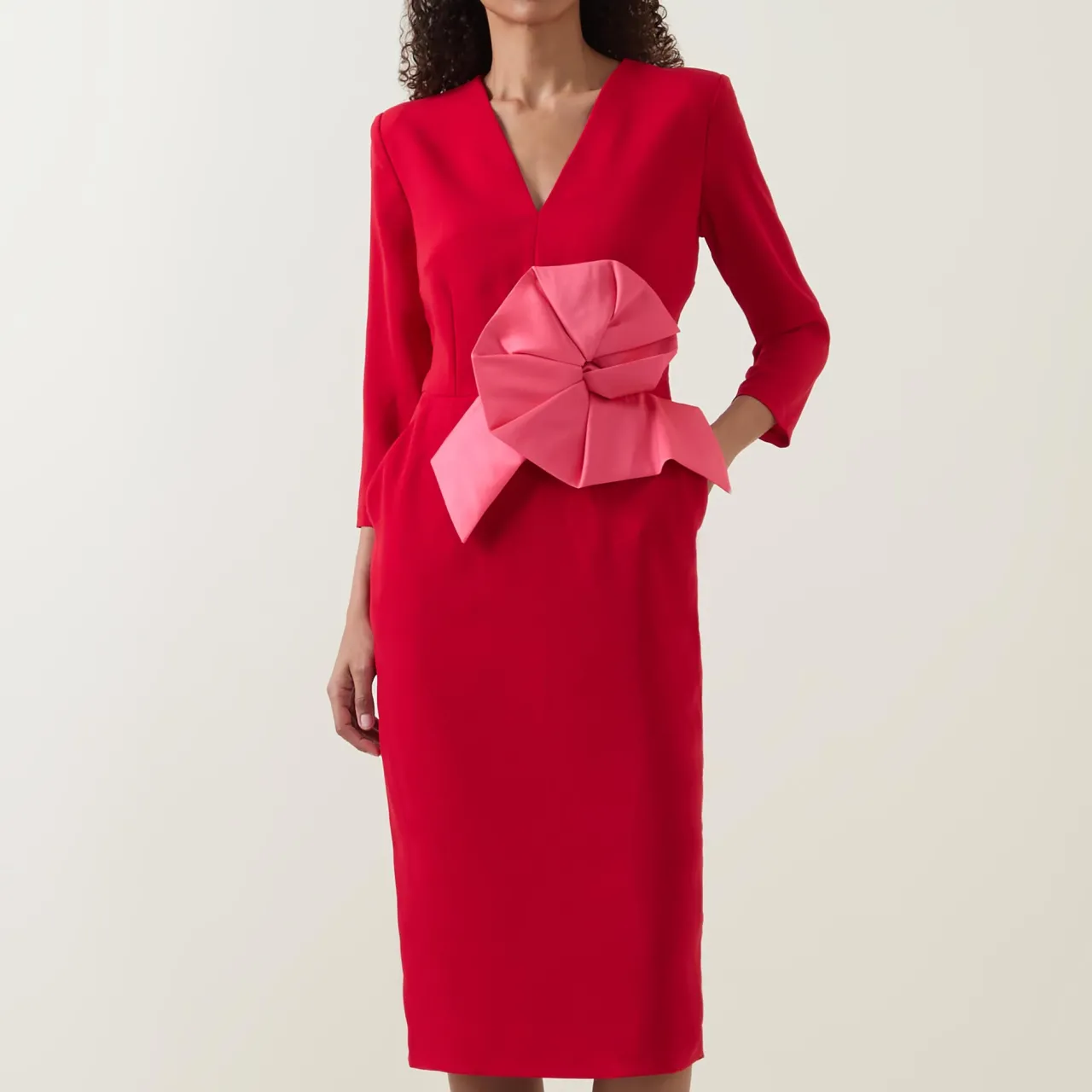 - V-neckline, mid-length sleeves, back zip-fastening closure, oversized flower appliqué to the waist, two side in-seam pockets, pencil silhouette, midi length