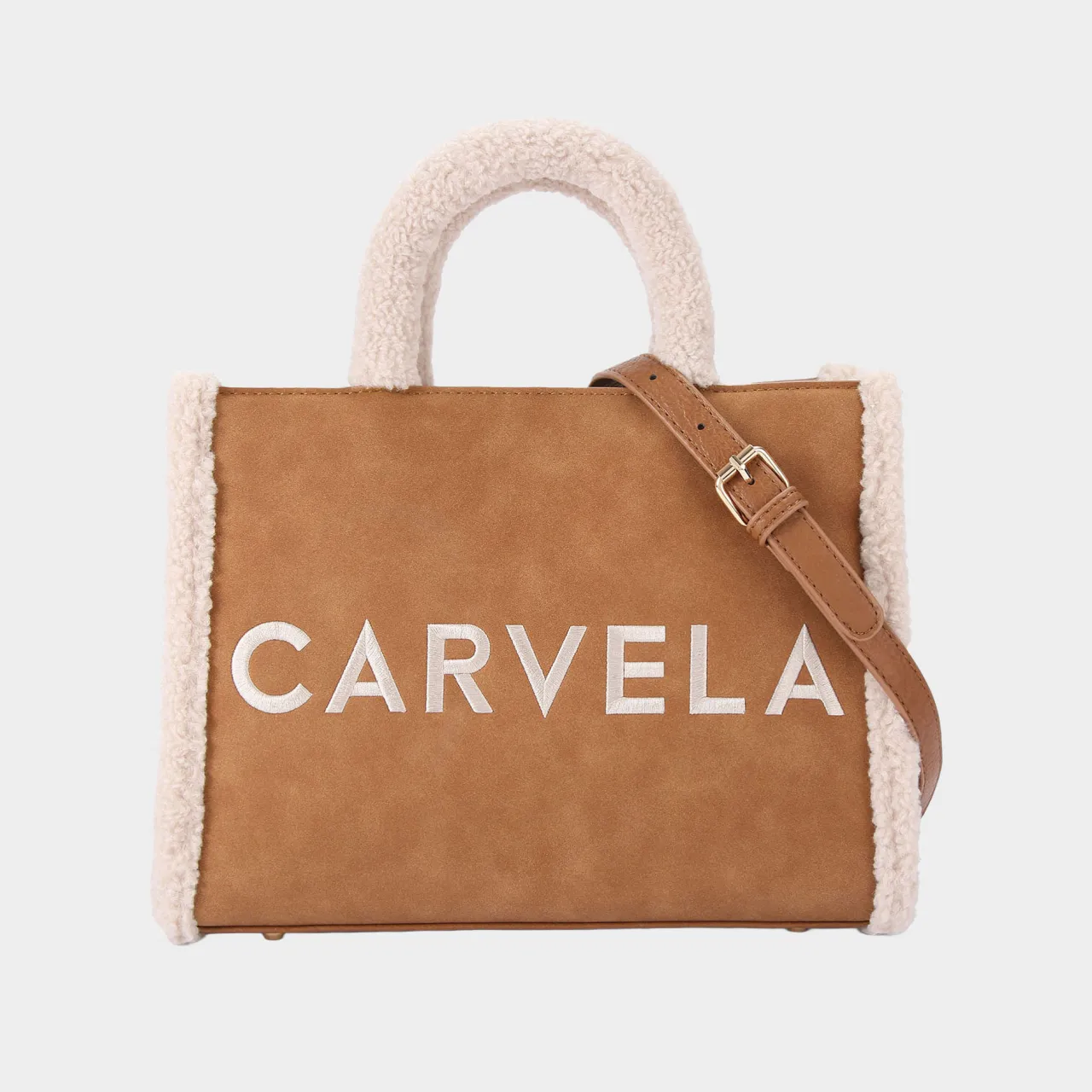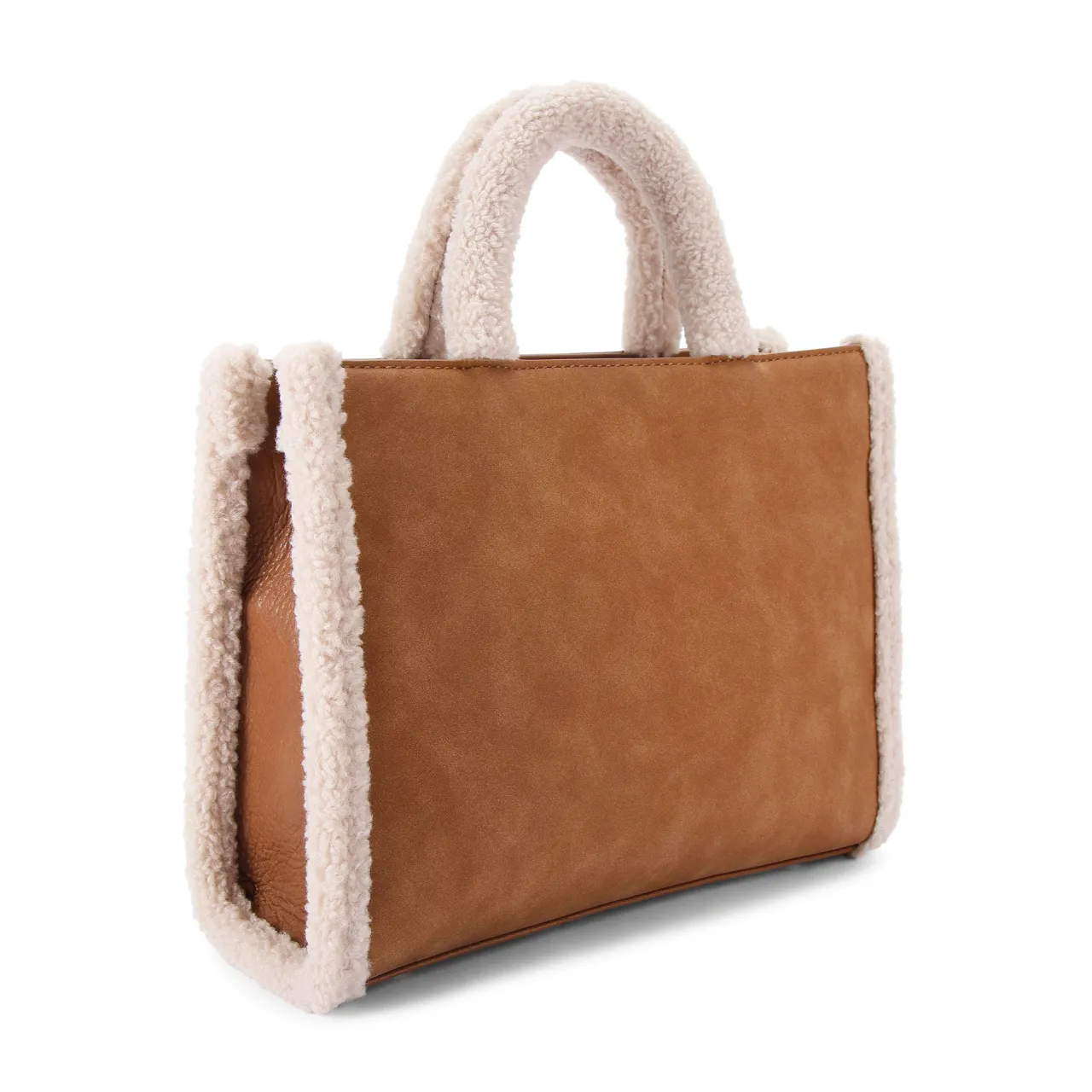 - Midi tote silhouette, microsuede design, faux Borg lining, embossed logo