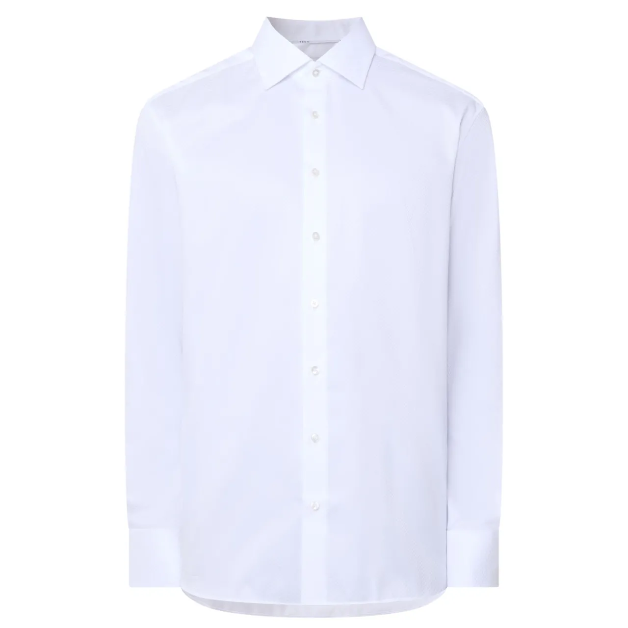 - Kent collar, button fastening, long sleeve, single-cuffs, curved hemline