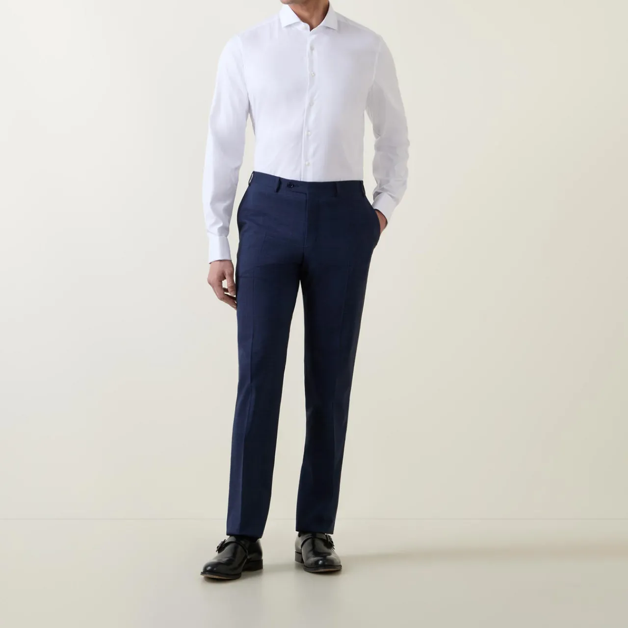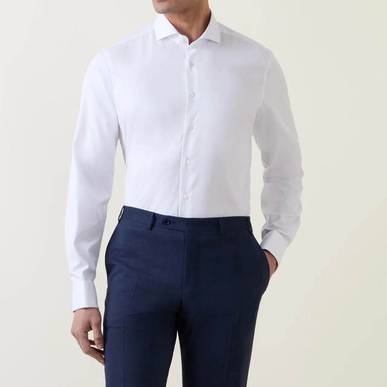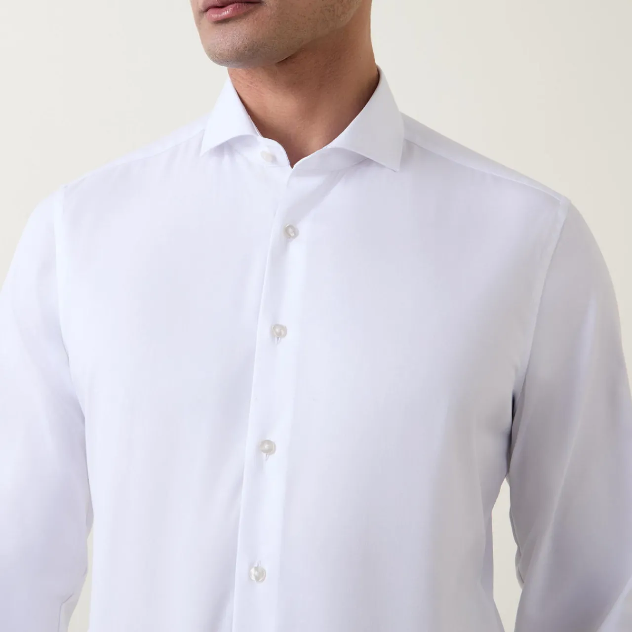 - Cutaway collar, long sleeves, button placket, tonal stitching, single-button cuffs, curved hemline, smooth fabric
