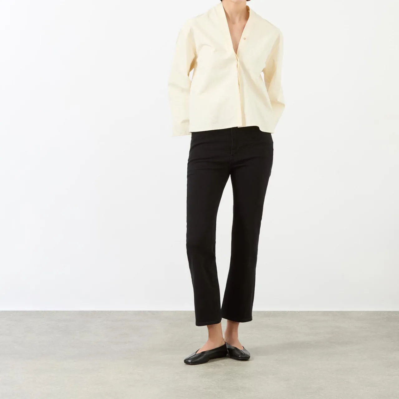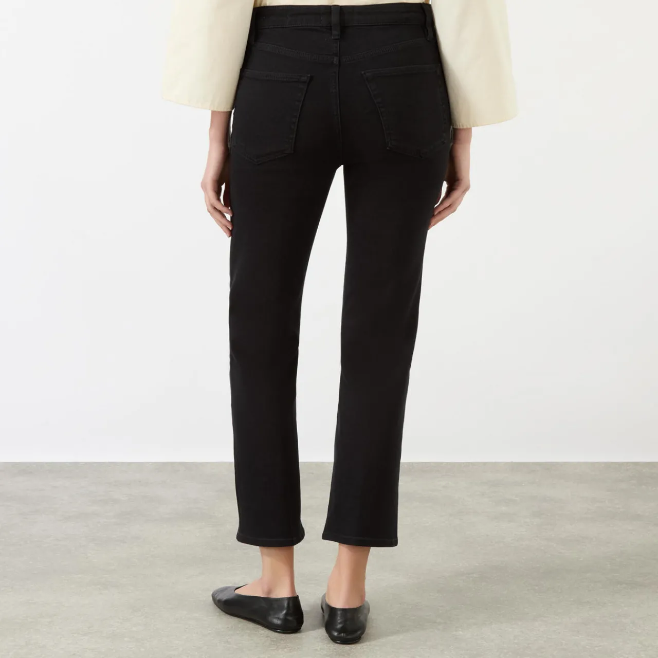 - Cropped length, high-rise, zip and button fly, five pockets, bootleg cut. belt loops