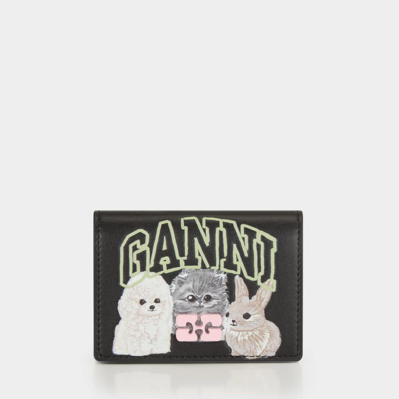 - Animal print, logo detail, card slots, snap button, keyring chain