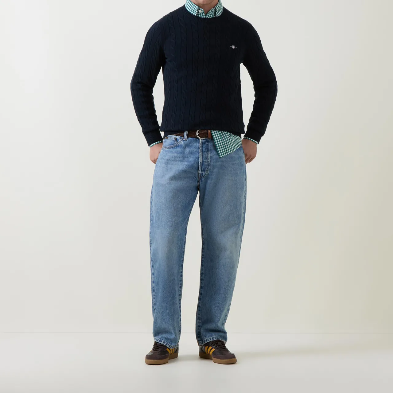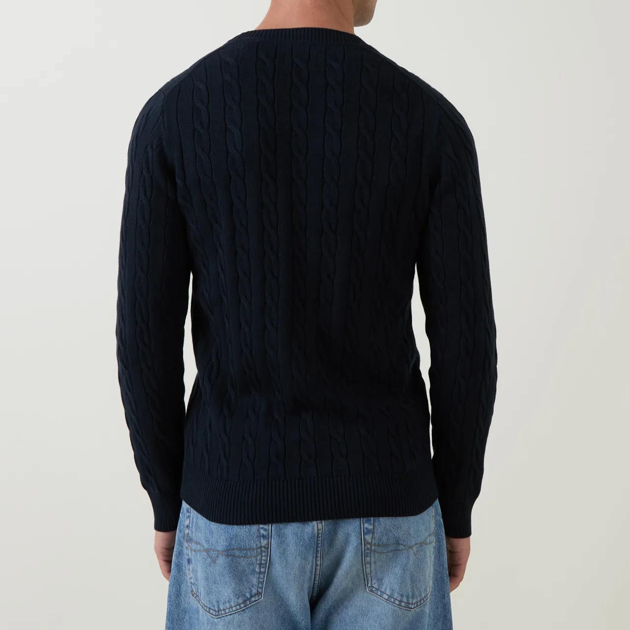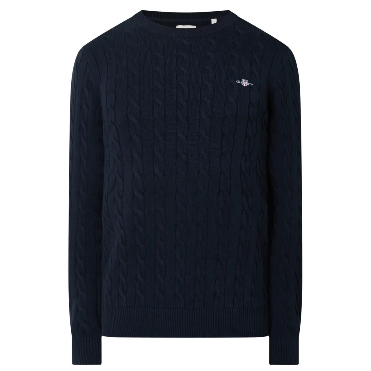 - Crew neckline, long sleeves, ribbed trims, straight hemline, cable knit structure, shield logo detail