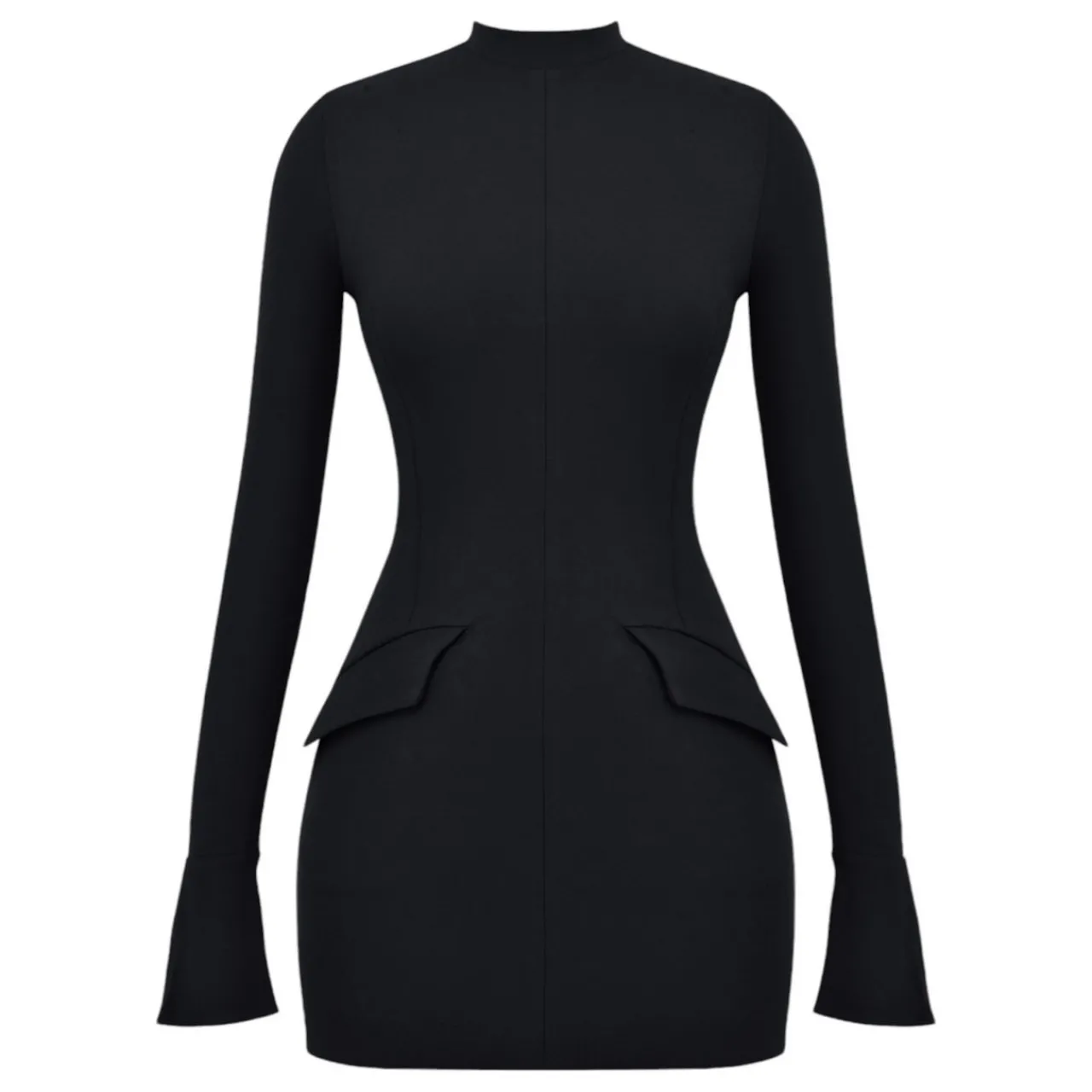 - Stretch-fused fabric, form-fitting style, decorative flap pockets, long sleeves, fluted cuffs, zip fastening, mini length, high band collar
