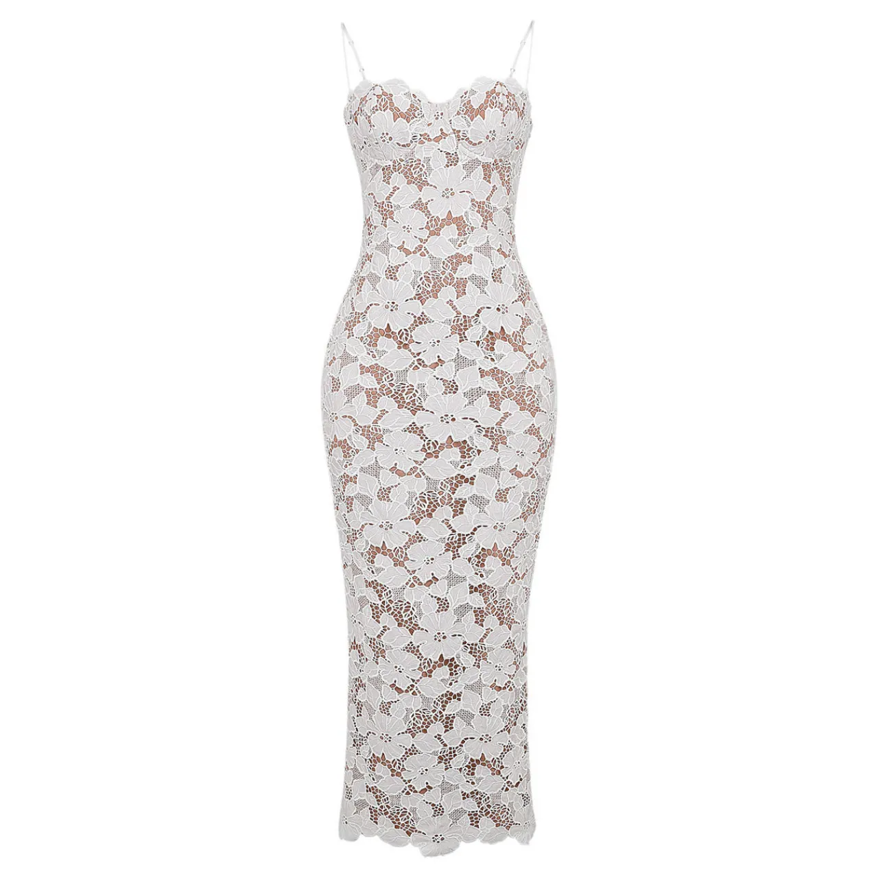 - Maxi length, floral embroidery, lined, supportive underwired cups, lace up back, thin shoulder straps, sweetheart neckline