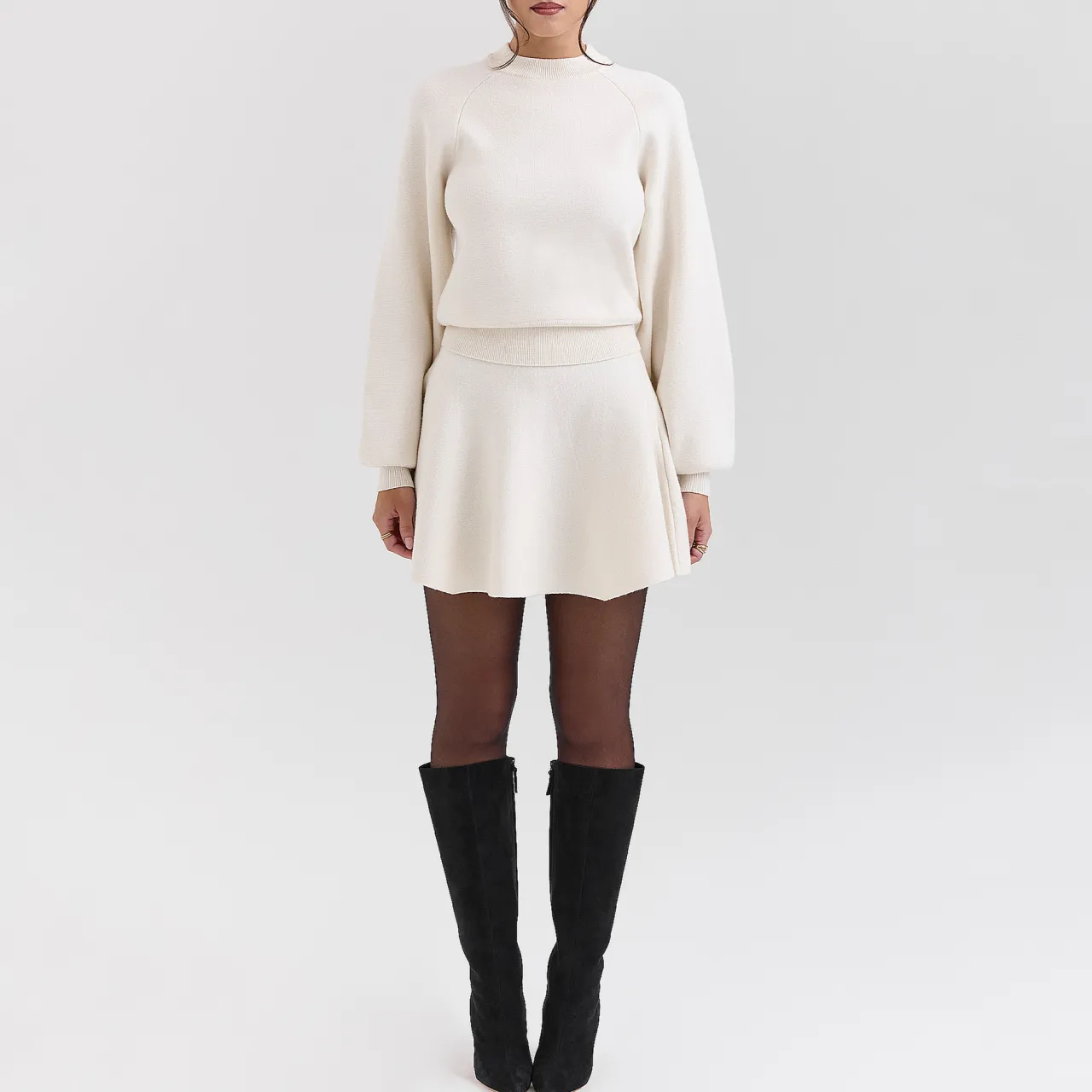 - Wool-cashmere blend, heavy weight knit, flared silhouette, elasticated waistband, mini length