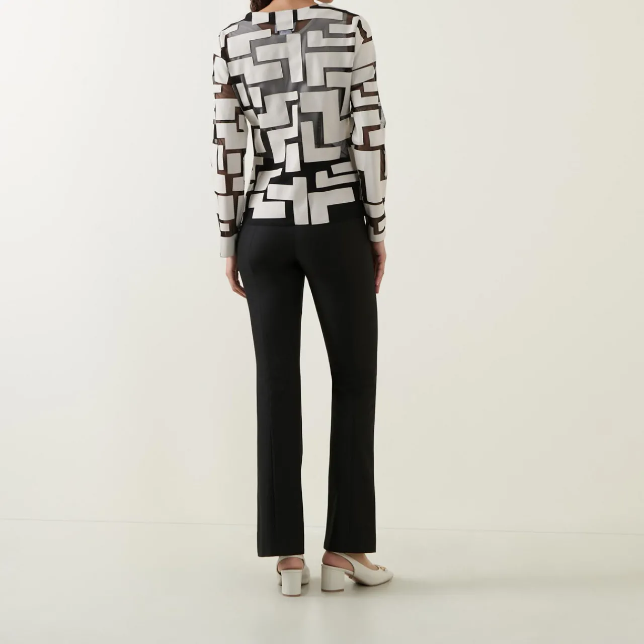 - Lazer-cut leatherette design, round neckline, semi-sheer, zip fastening, long sleeves