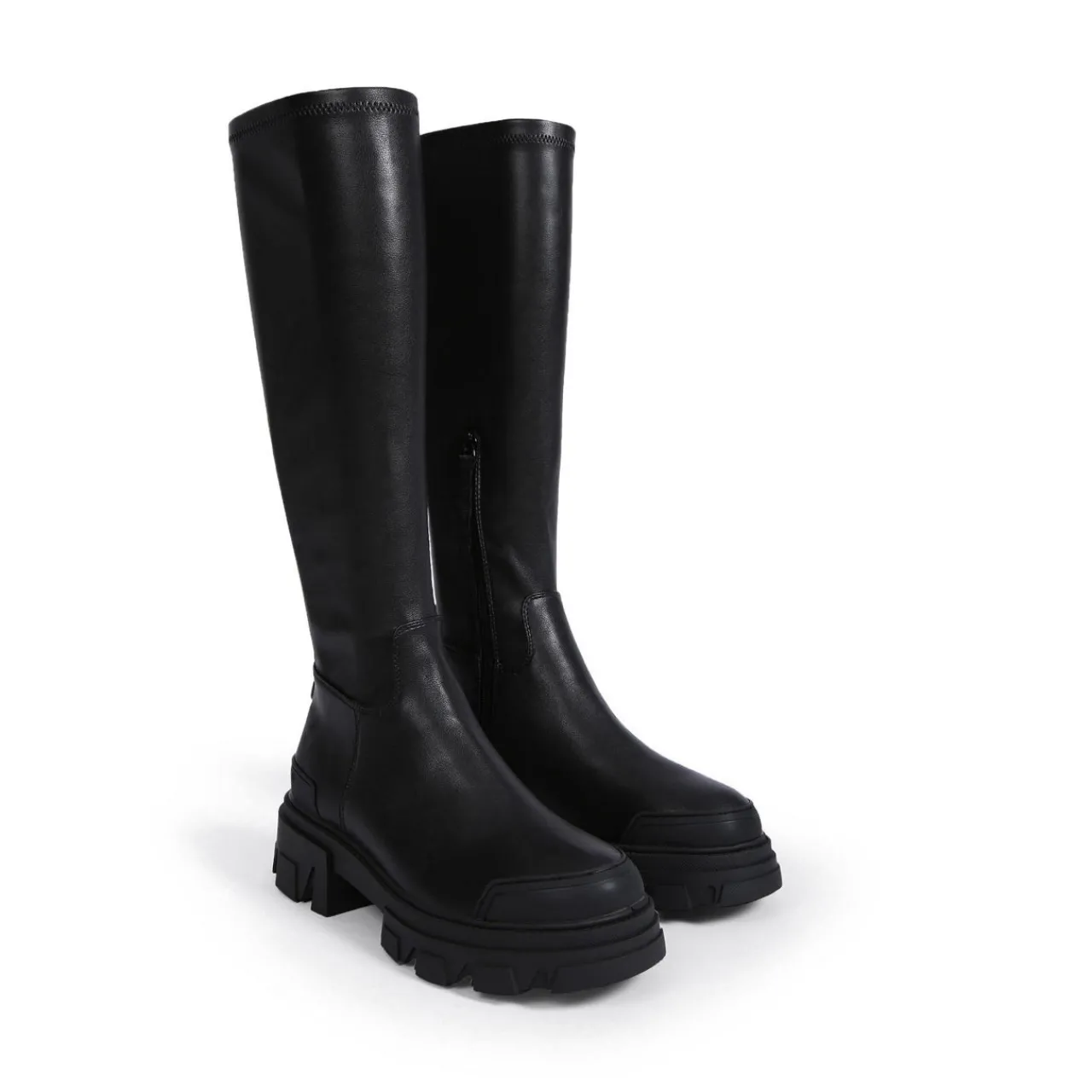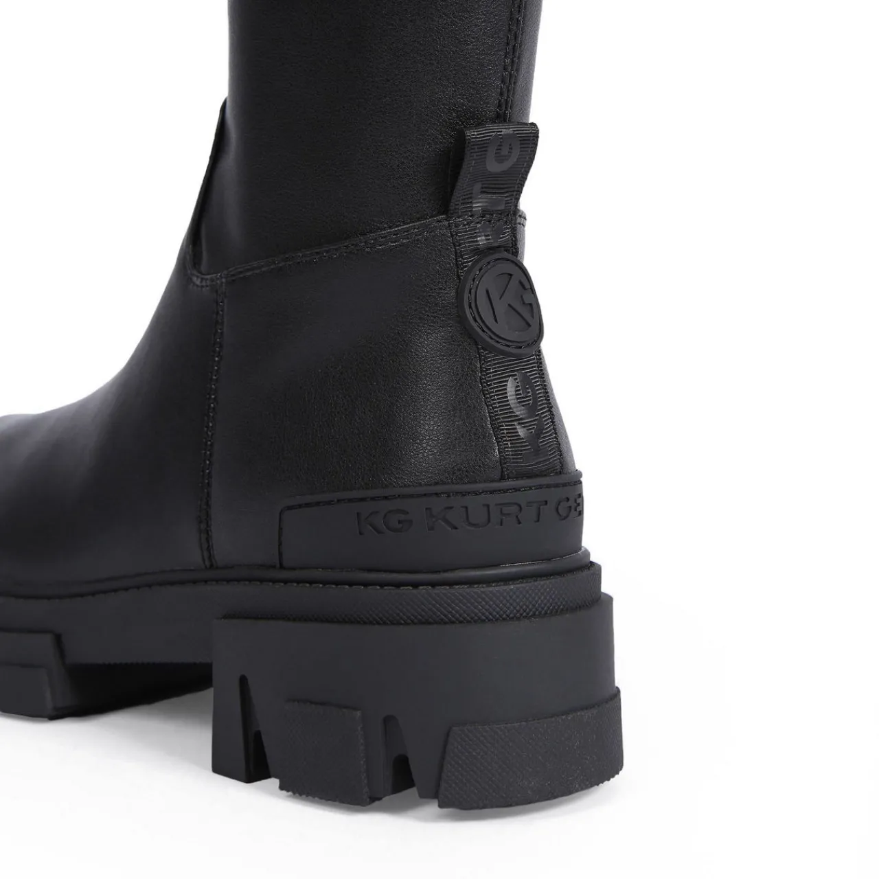 - Knee high sock, logo pull tab, round toe with toe cap, chunky tread sole