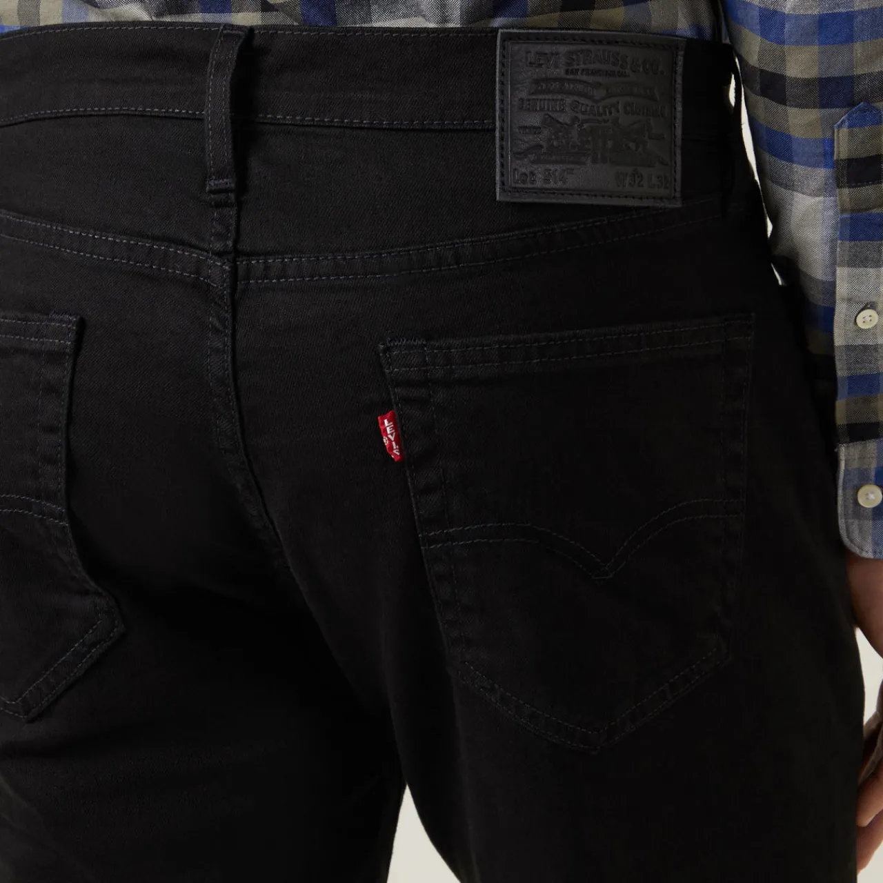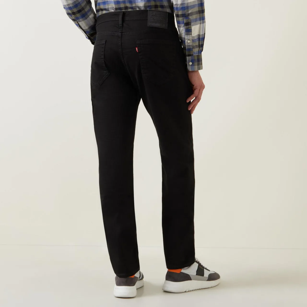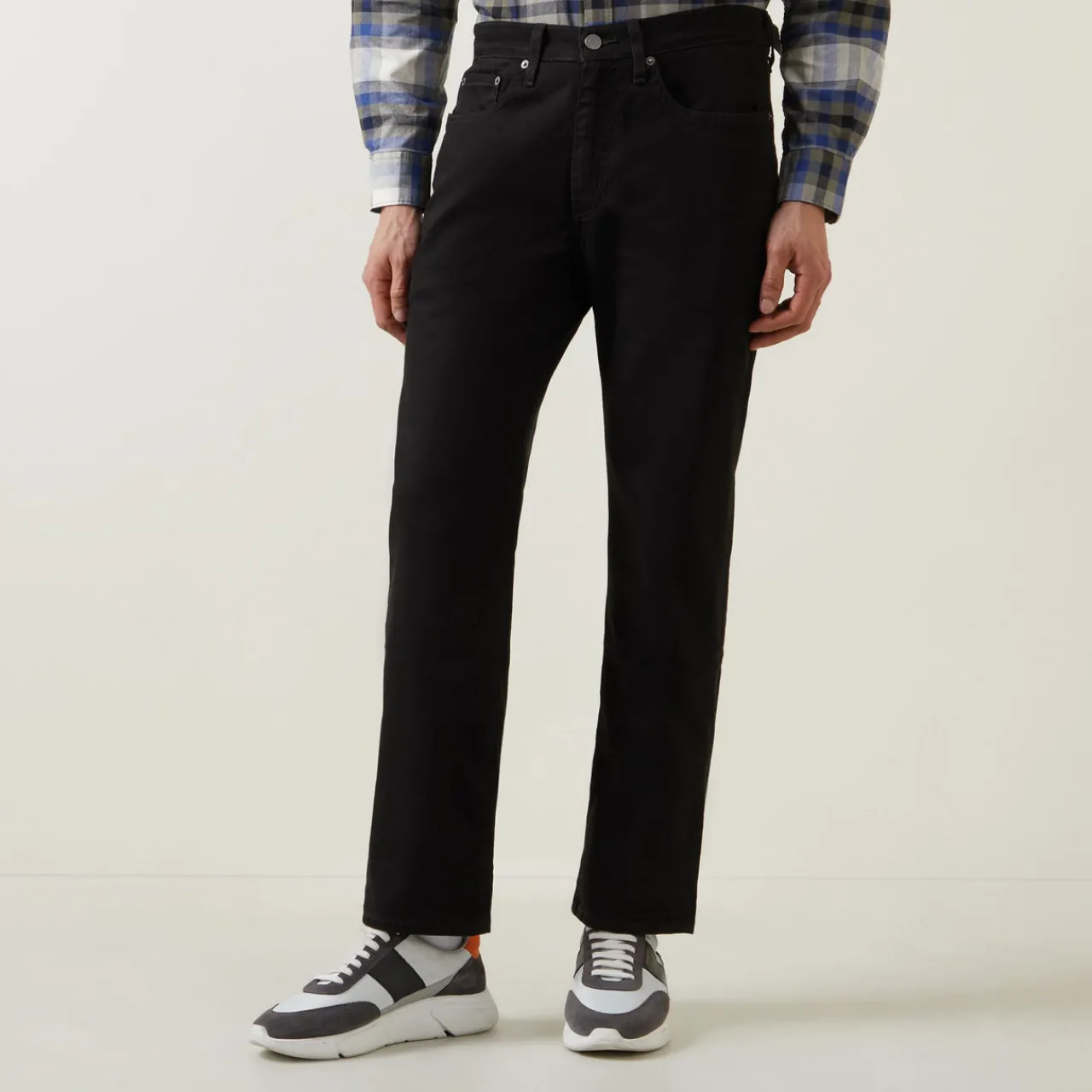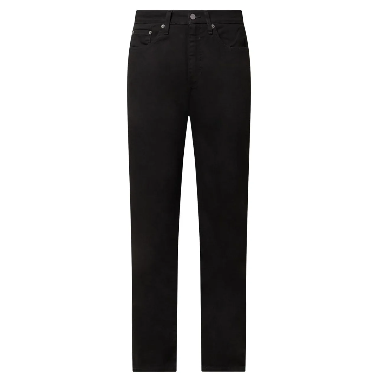 - Mid-rise, straight leg, zip fly and button fastening, belt loops, five-pocket design, tonal stitching, logo patch
