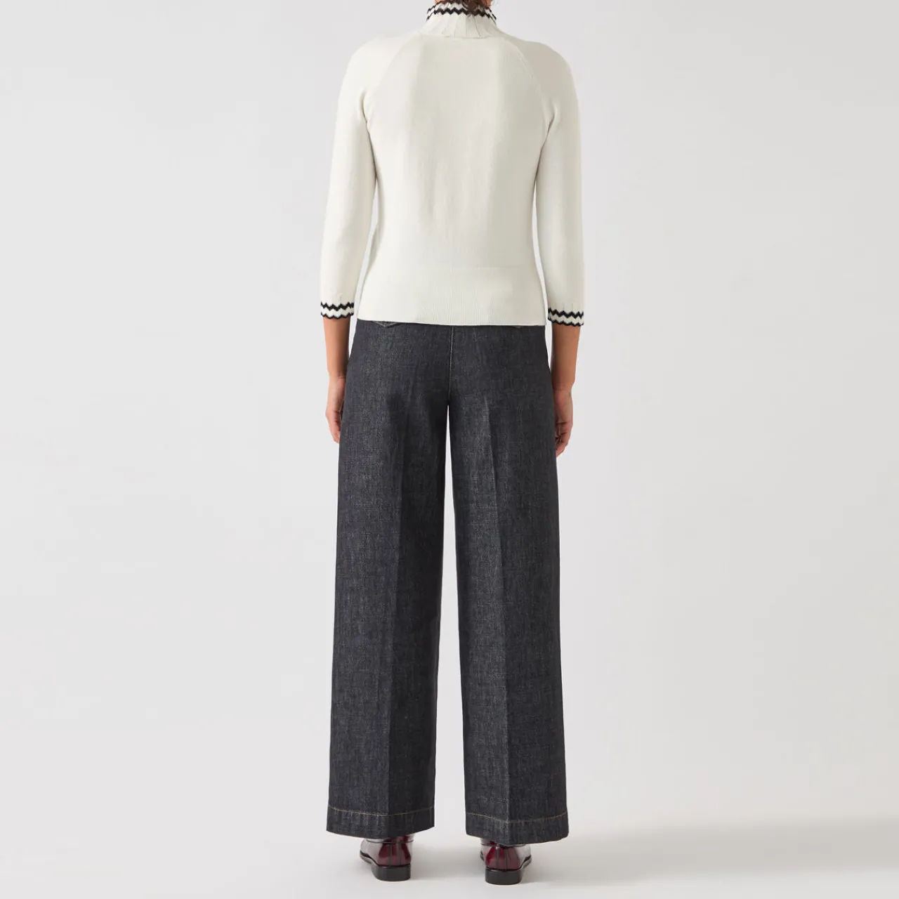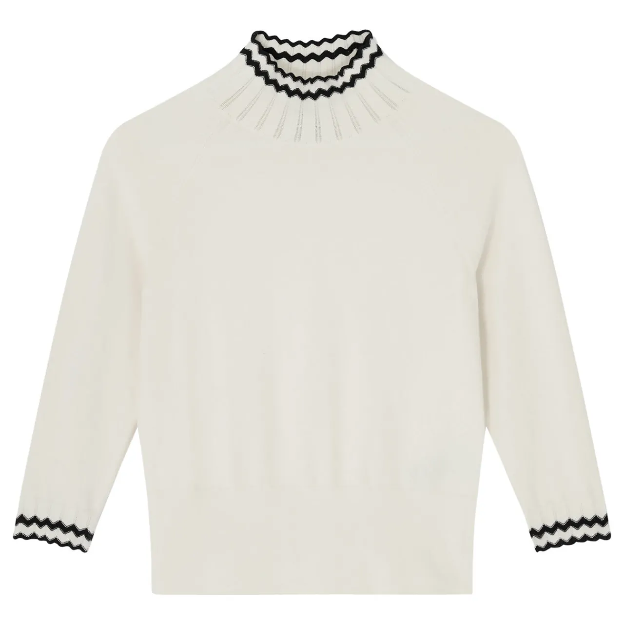 - Mock neckline, three-quarter-length sleeves, ribbed trims, knit structure, zigzag stitched details