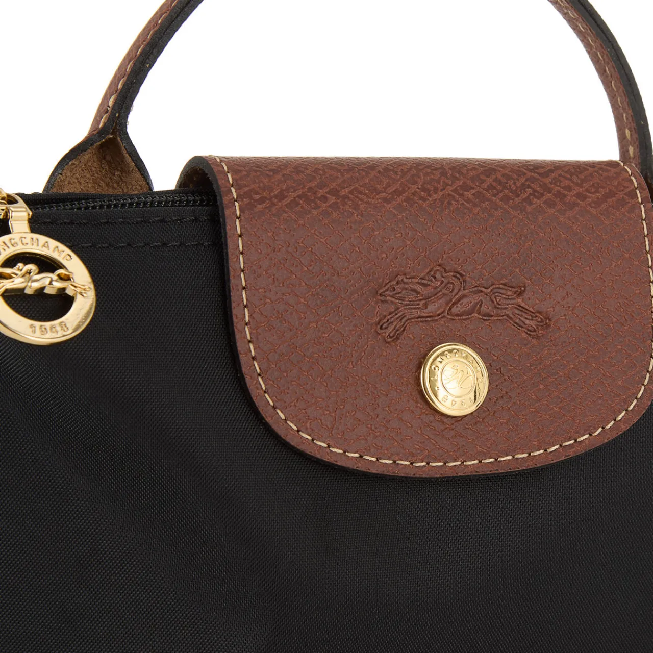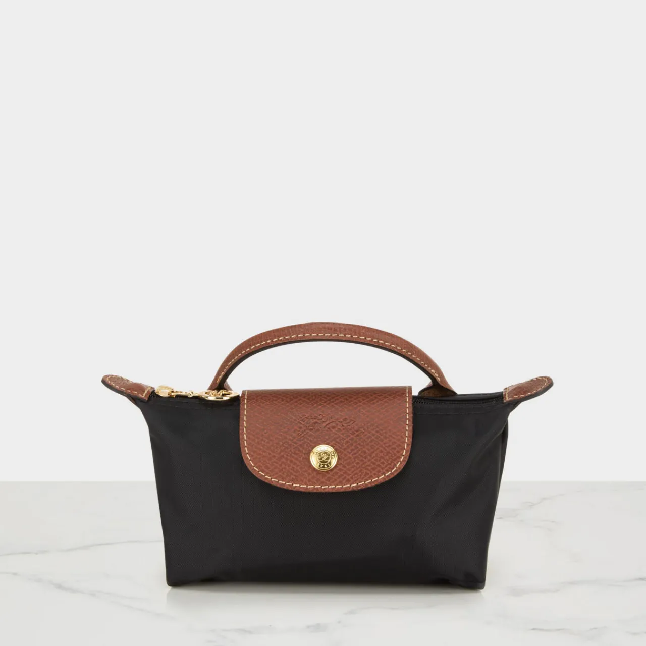 - Top handle, flap with snap button fastening, top zip closure, gold-tone hardware, smooth finish, fold-away design