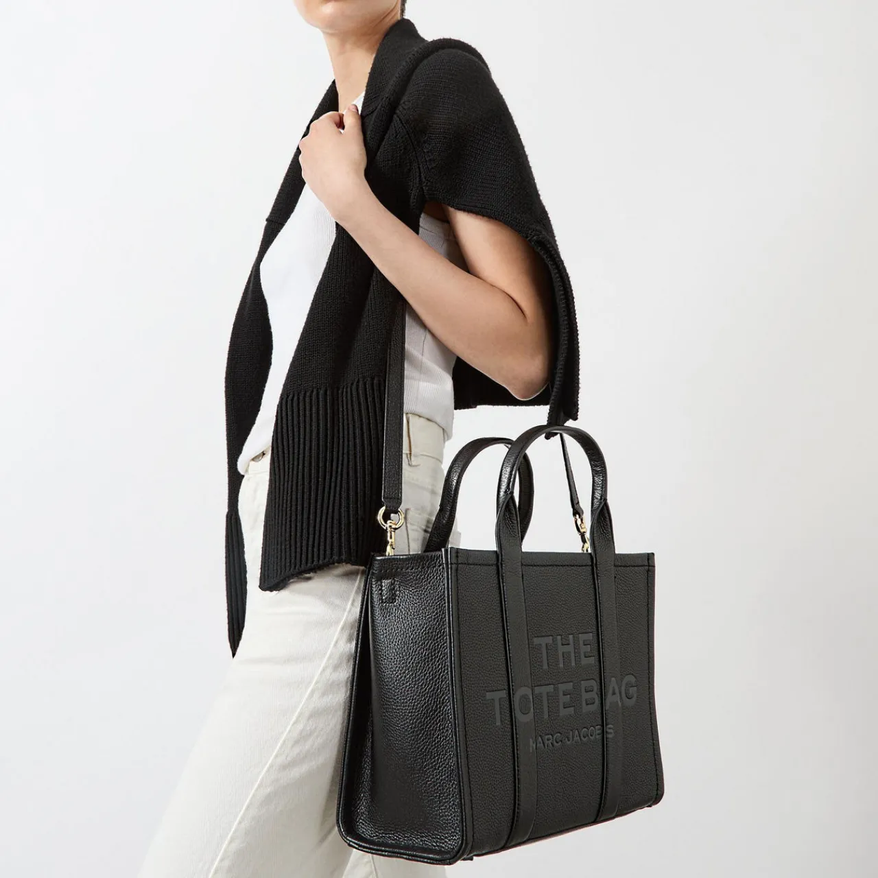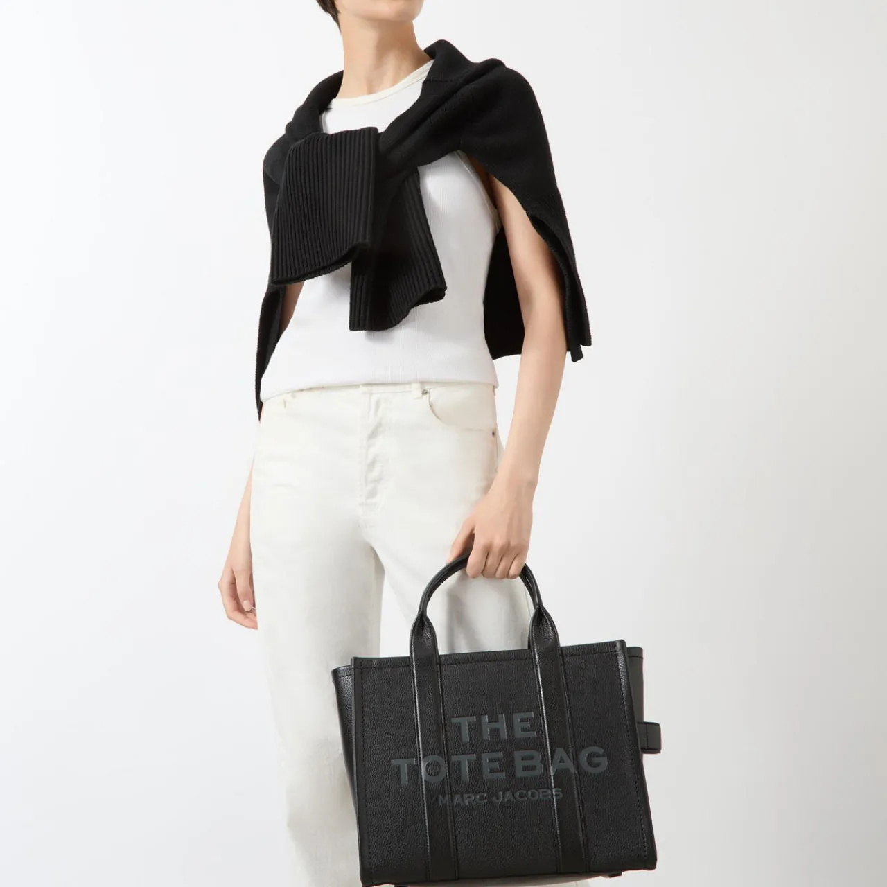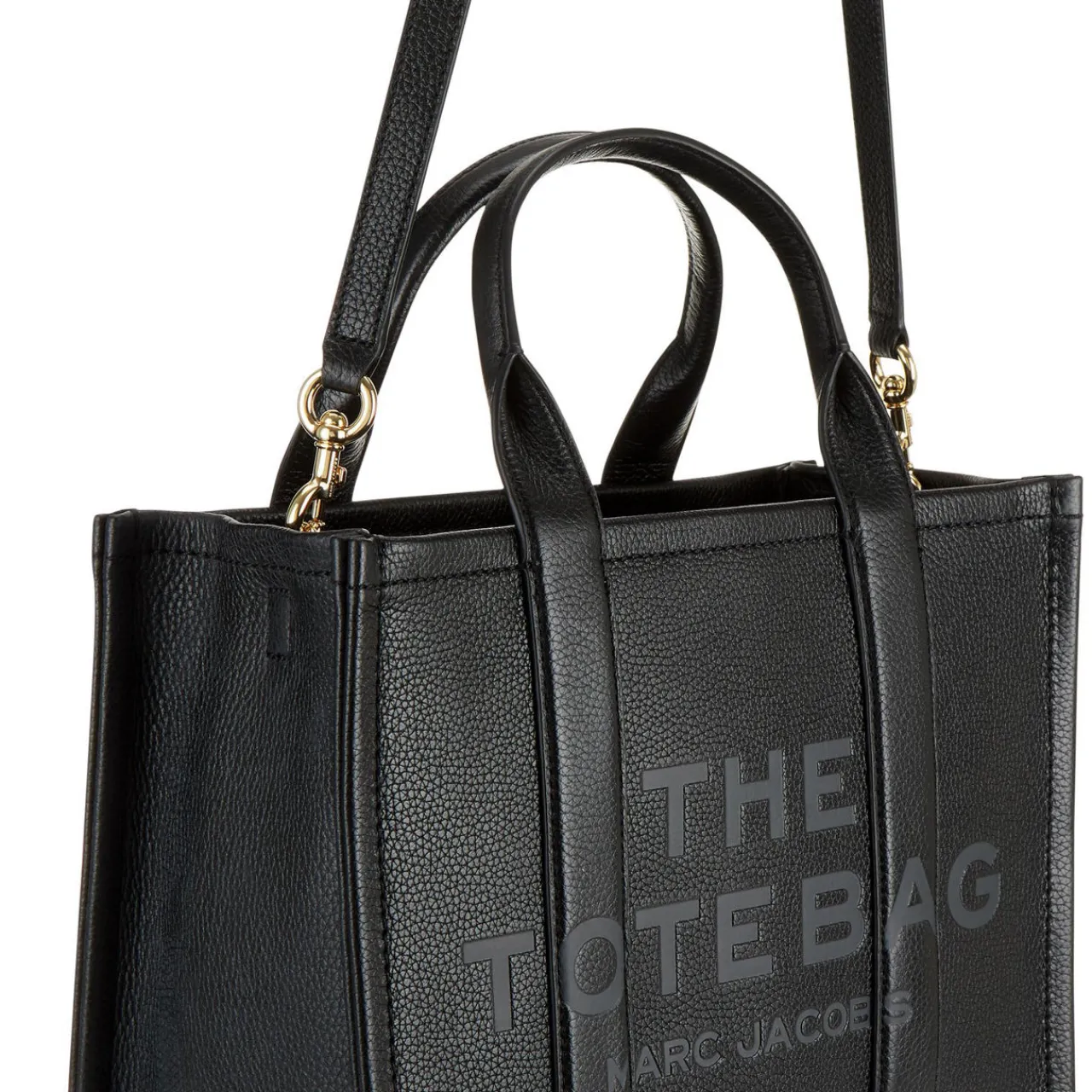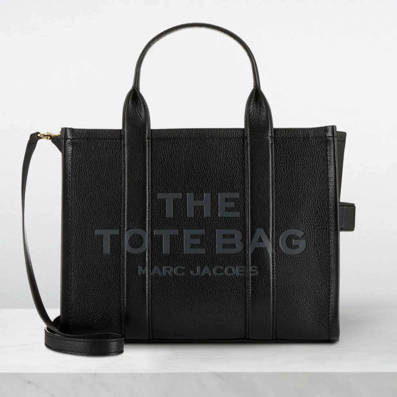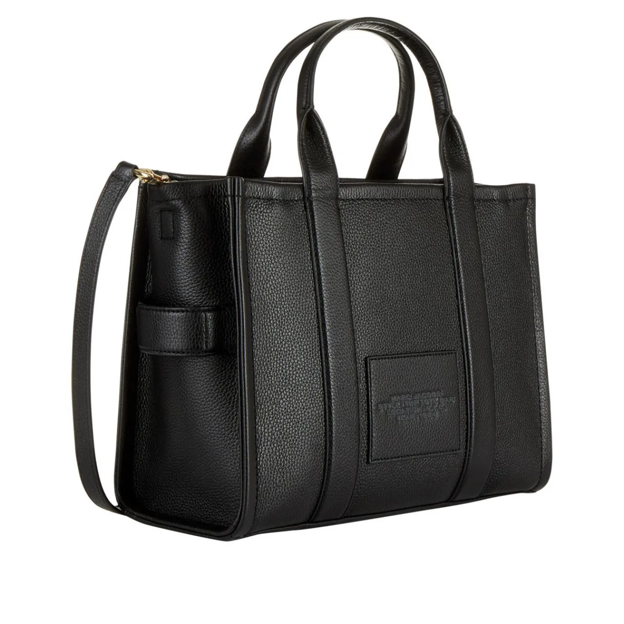 - Boxy shape, zip-top fastening, logo detail, top handle, removable strap.