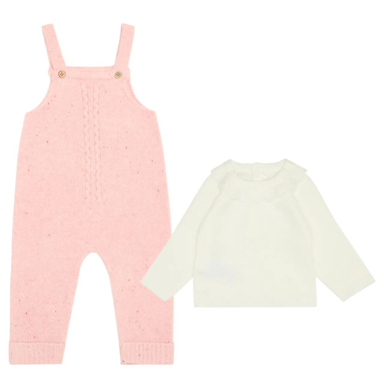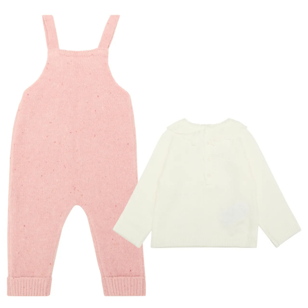 - Sweater: Long sleeves, ruffle collar, ribbed hemline and cuffs, knitted finish. Dungarees: Sleeveless, two straps, cable-knit stitch detail to the front, ribbed cuffs, knitted finish