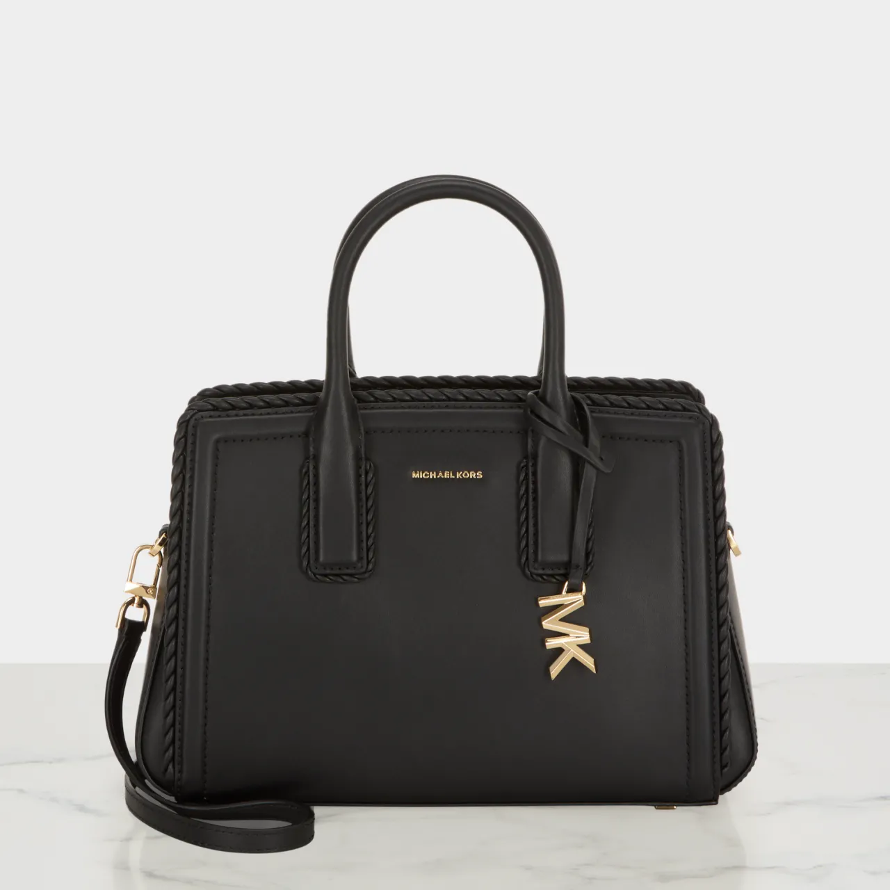 - Two top carry handles, detachable adjustable crossbody strap, logo lettering to the front, gold-tone hardware, top zip-fastening closure, hanging MK logo charm, tonal stitching, woven leather trims, protective metal studded feet, smooth leather finish