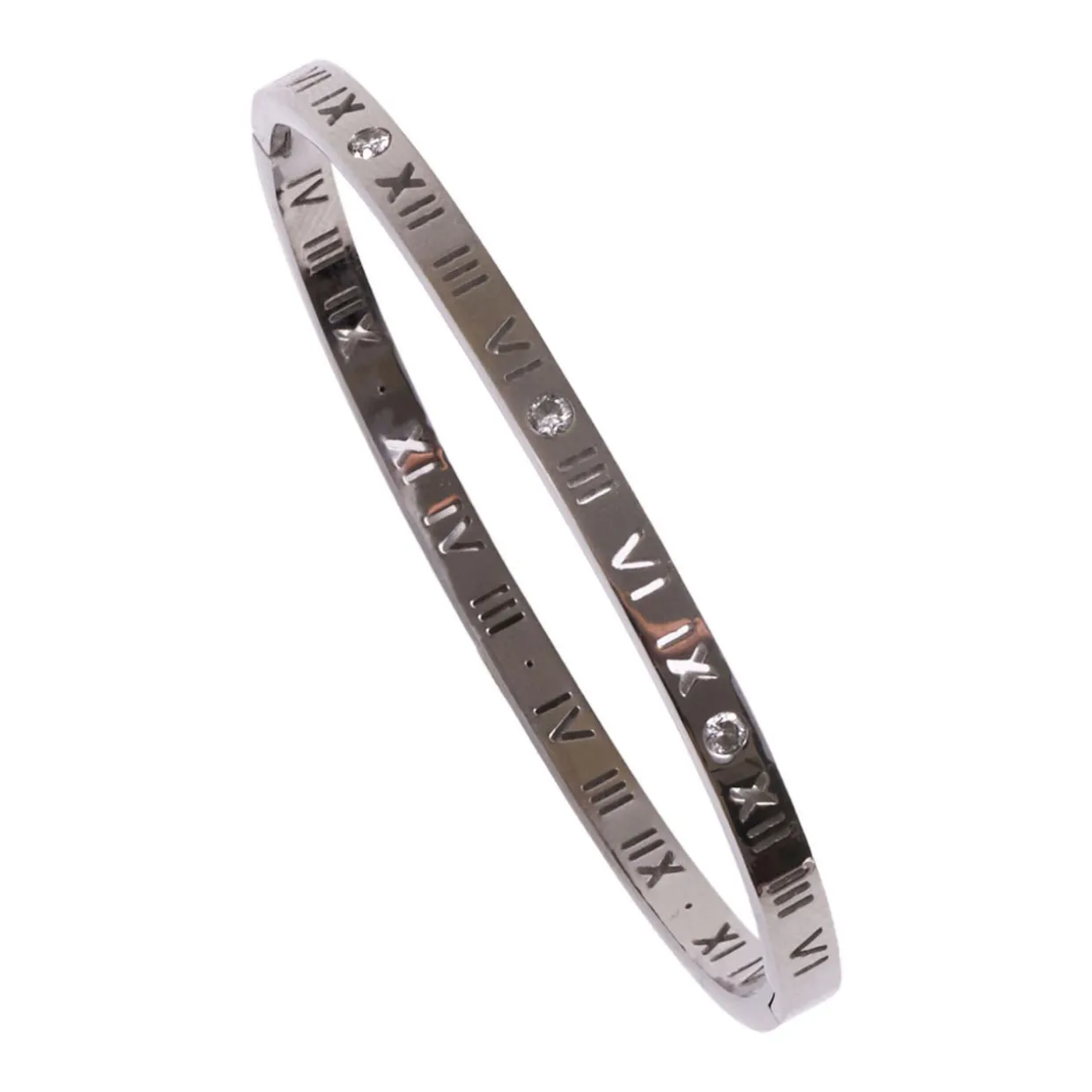 - Bangle style, clasp closure, numeral detailing, stone embellishment, presented in a gift box