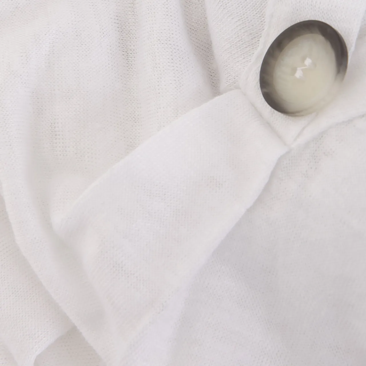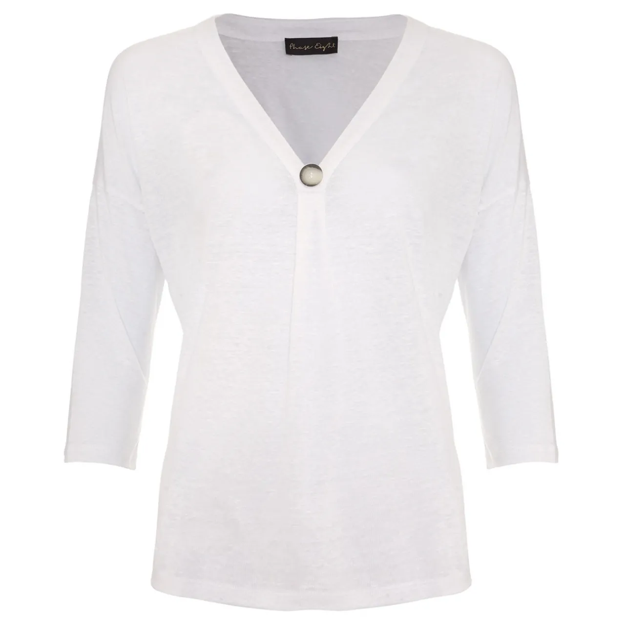 - V-neckline, three-quarter length sleeves, front button, pleated detail, straight hem, lightweight