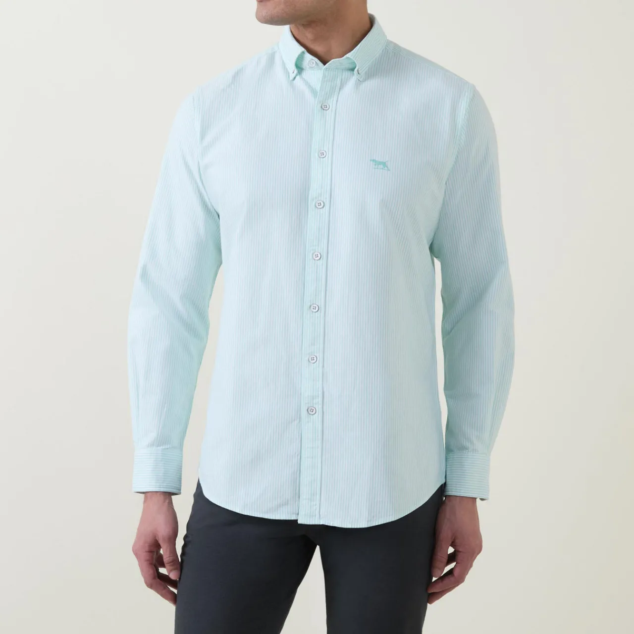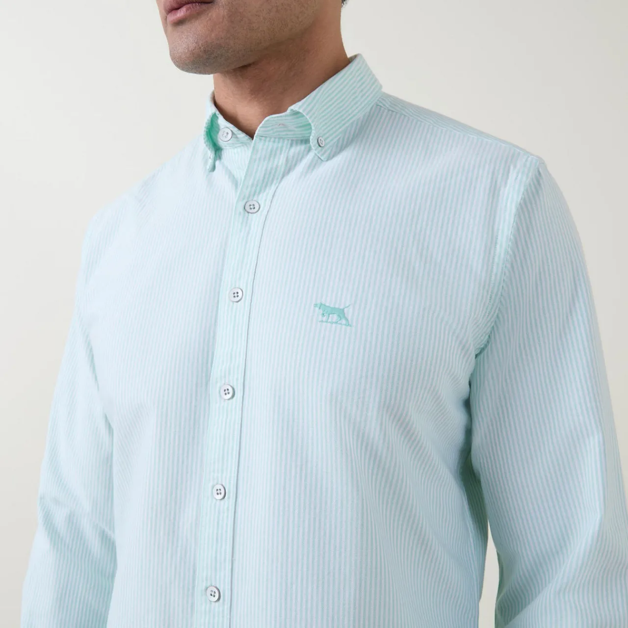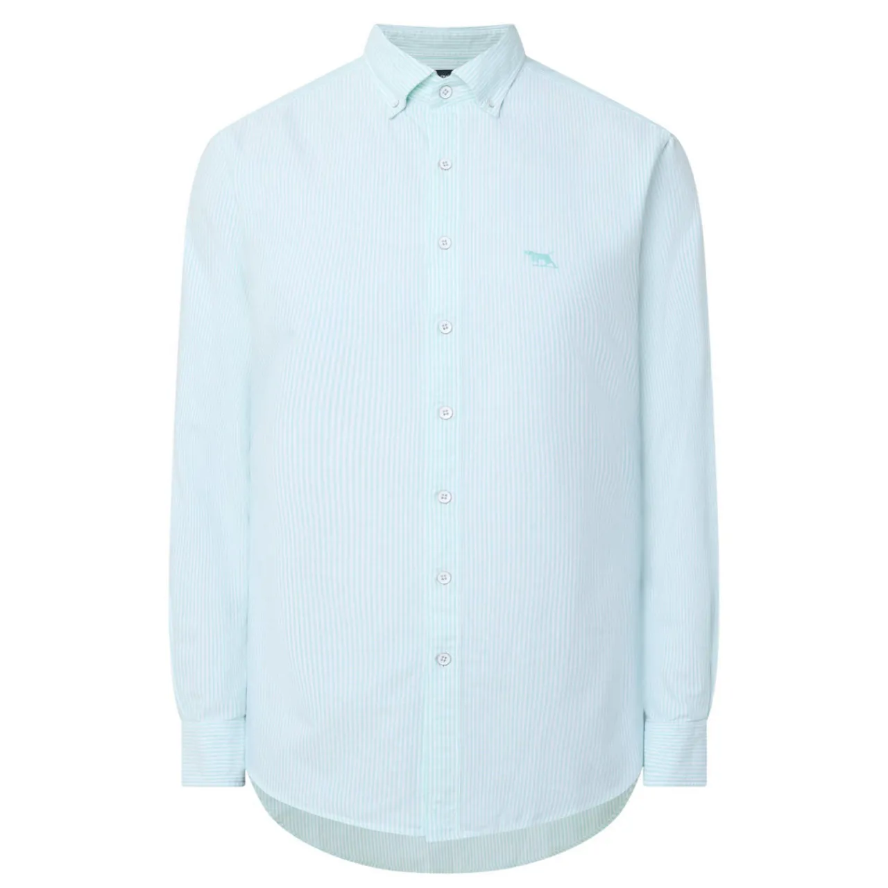 - Striped print, long sleeves, structured buttoned cuffs, curved hem, embroidered logo on chest, slim fit