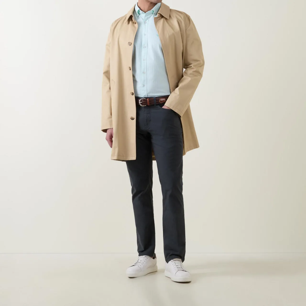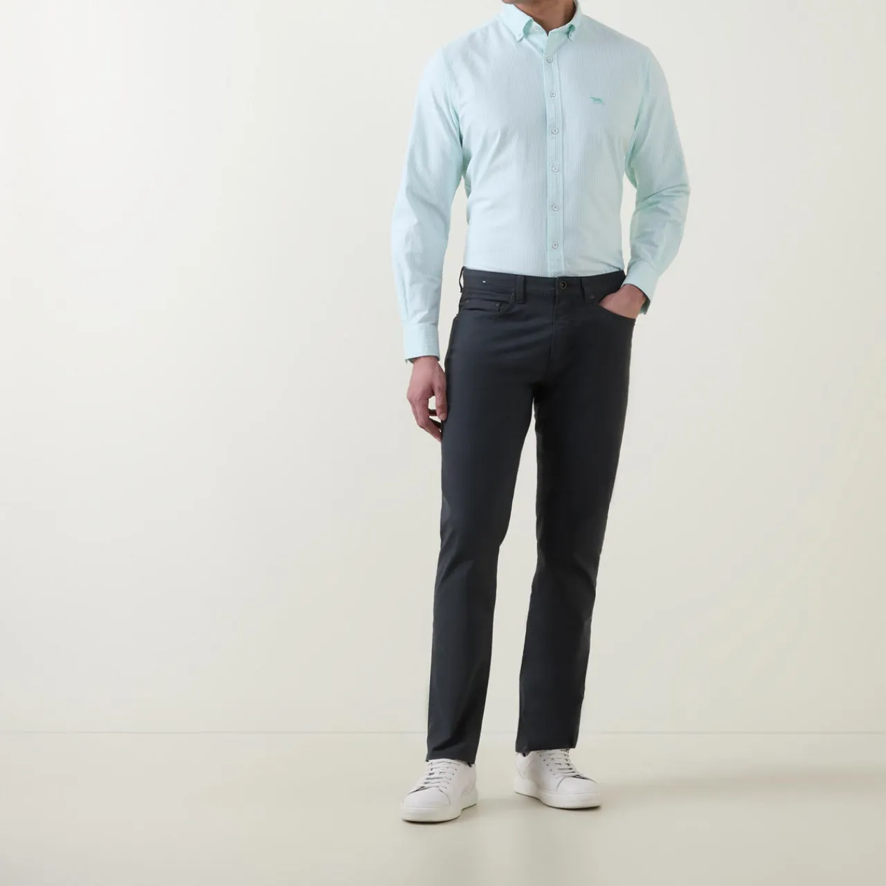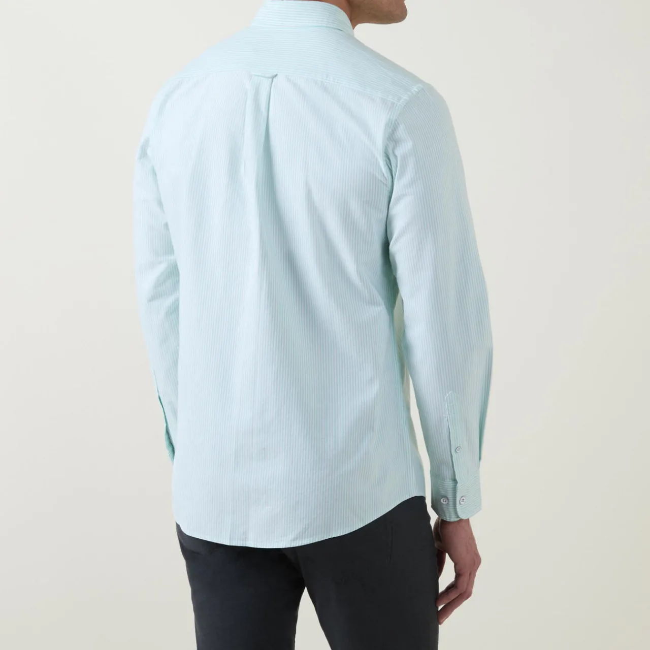 - Striped print, long sleeves, structured buttoned cuffs, curved hem, embroidered logo on chest, slim fit