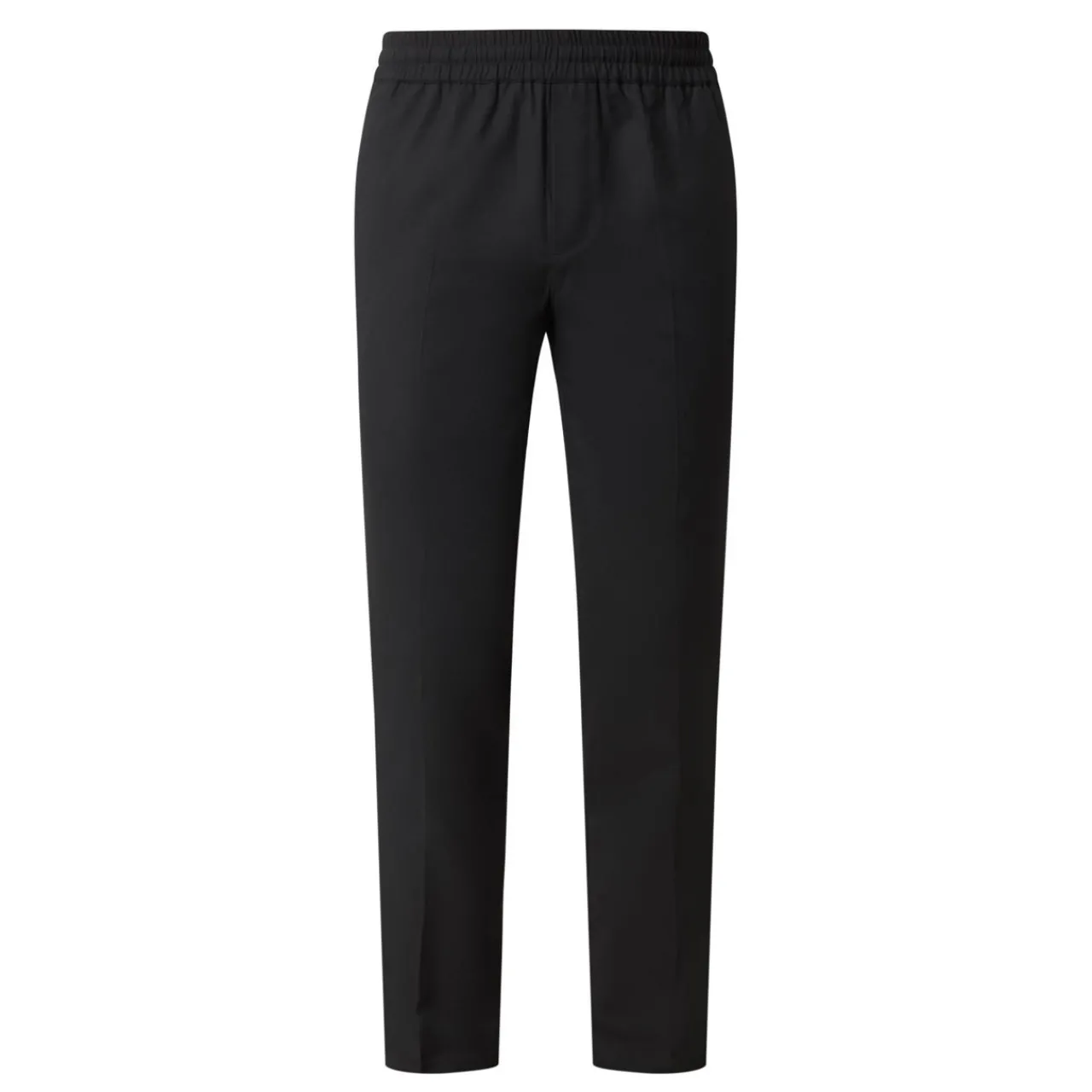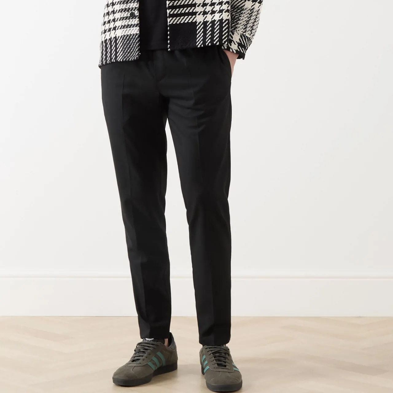 - Mid-rise, slim leg, elasticated waistband, mock fly, two side slit pockets, one rear welt pocket with zip fastening, clean hems, pressed creases, logo detail