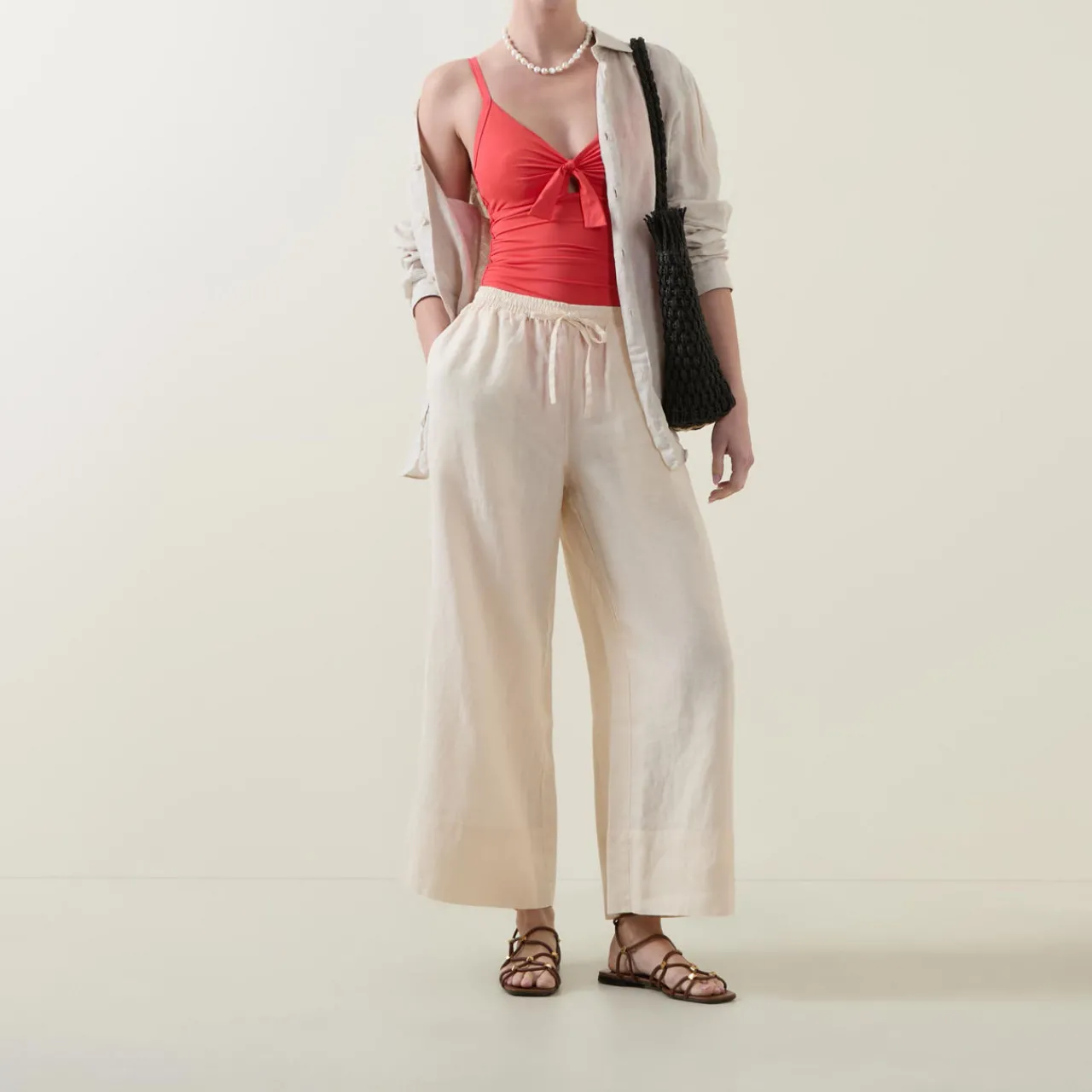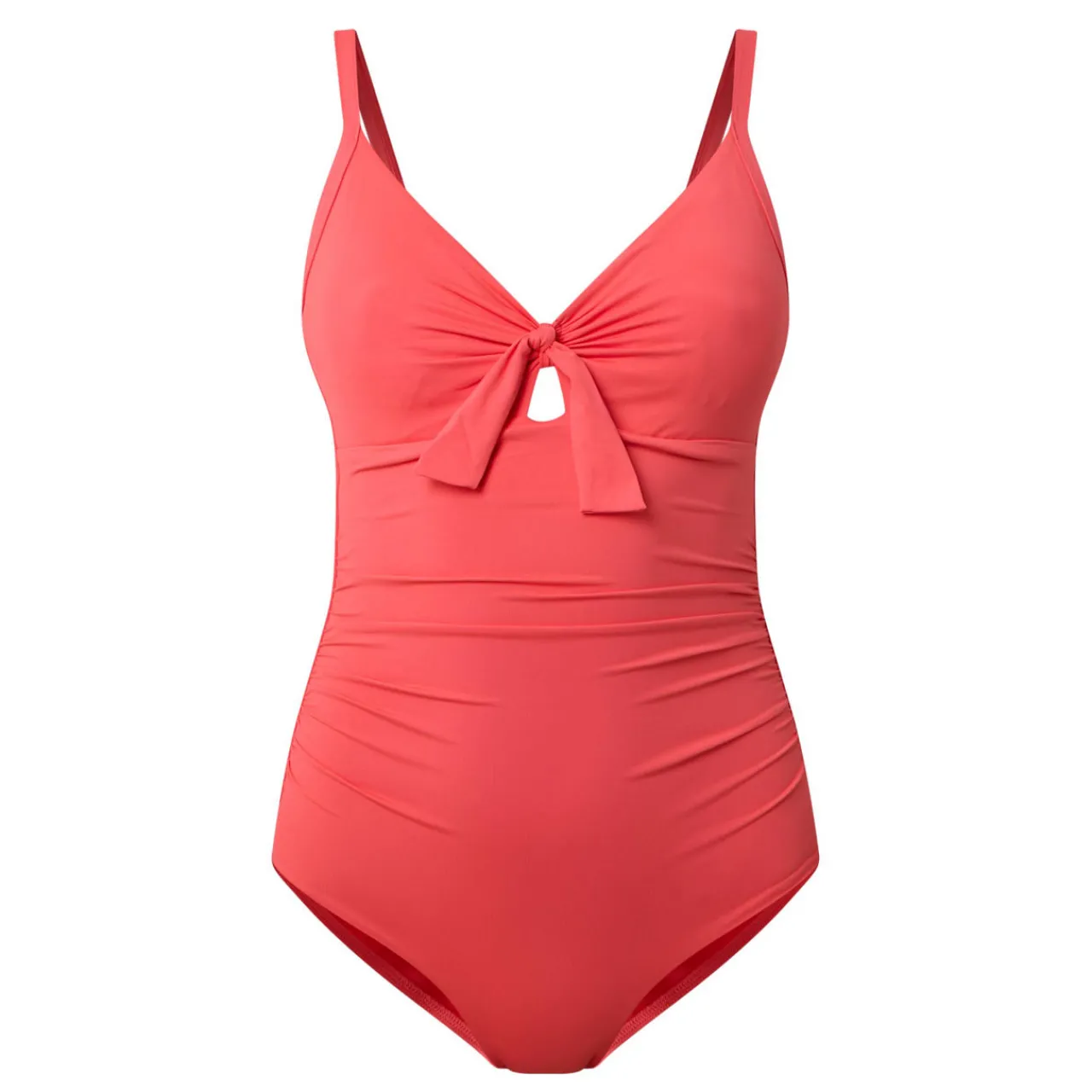 - V-neckline, tie-front fastening, adjustable shoulder straps, full coverage, solid design, ruched detailing, smooth finish, logo branding