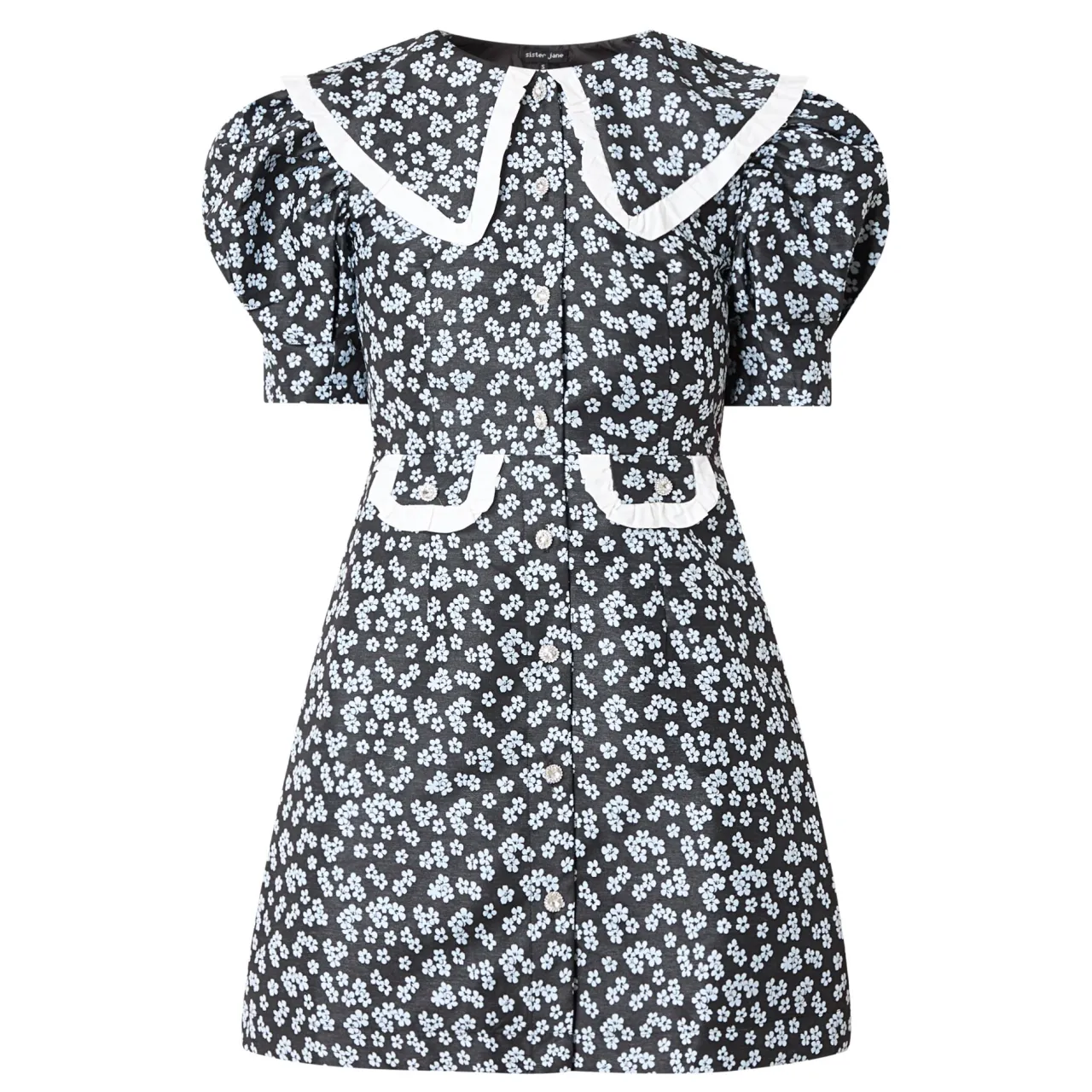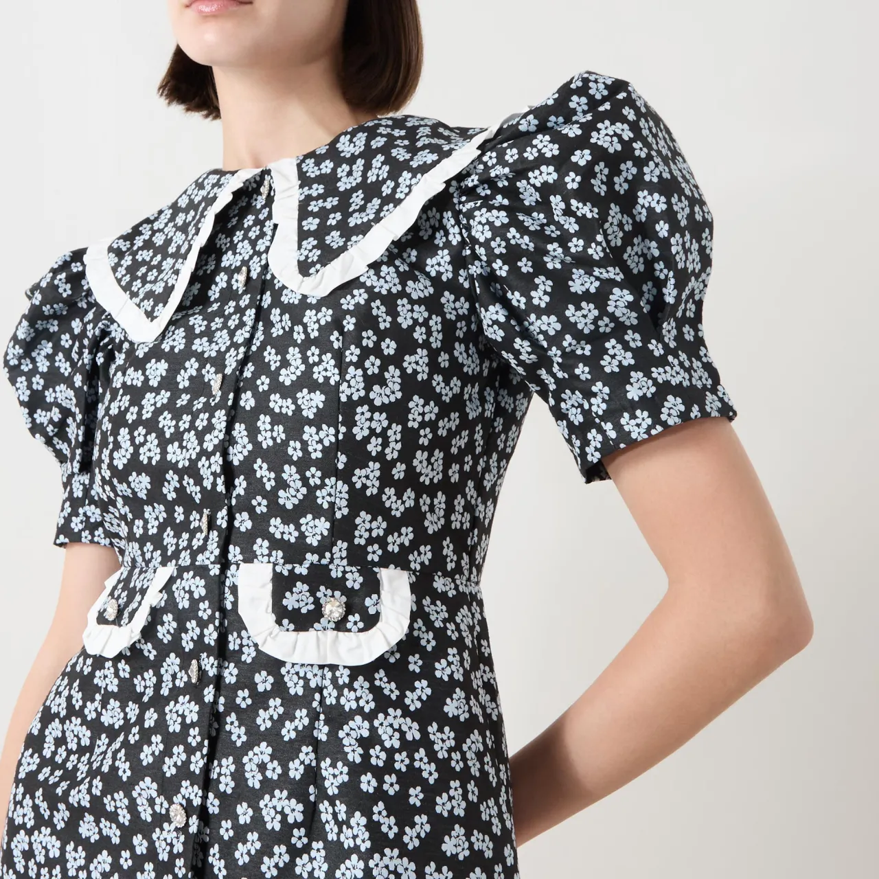 - Oversized collar, ditsy print, puff shoulders, gemstone buttons, mini length, pocket flaps