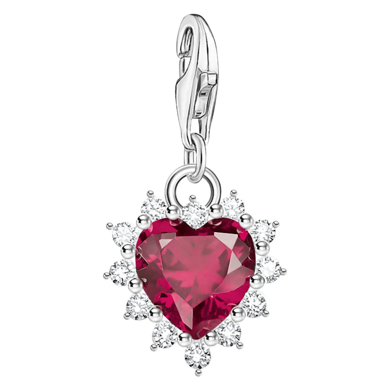 - Heart-shaped charm, 925 silver, lab-grown ruby, zirconia stone embellishment, lobster clasp fastening